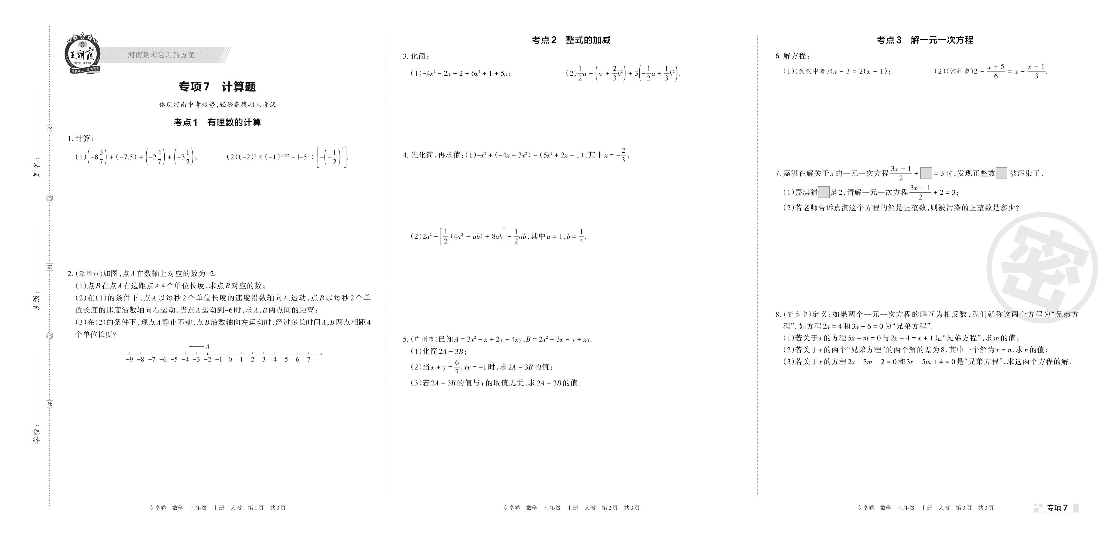 王朝霞期末专项卷——计算题七年级上册数学(人教版)【7】