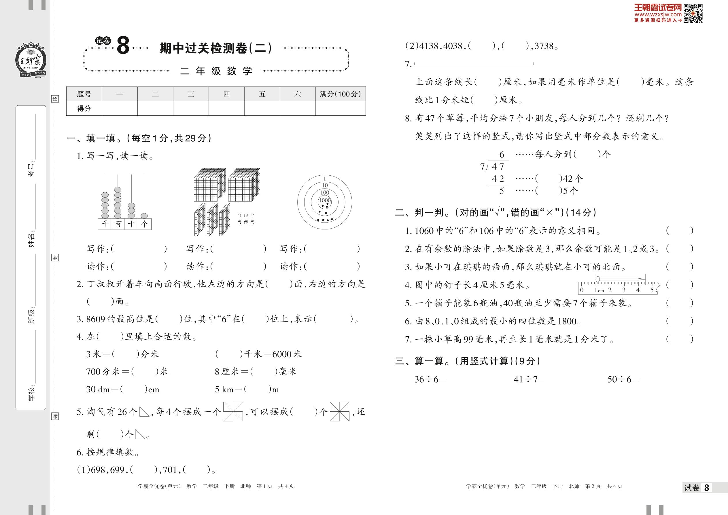2023下册二年级数学北师版 试卷8 期中过关检测卷(二)
