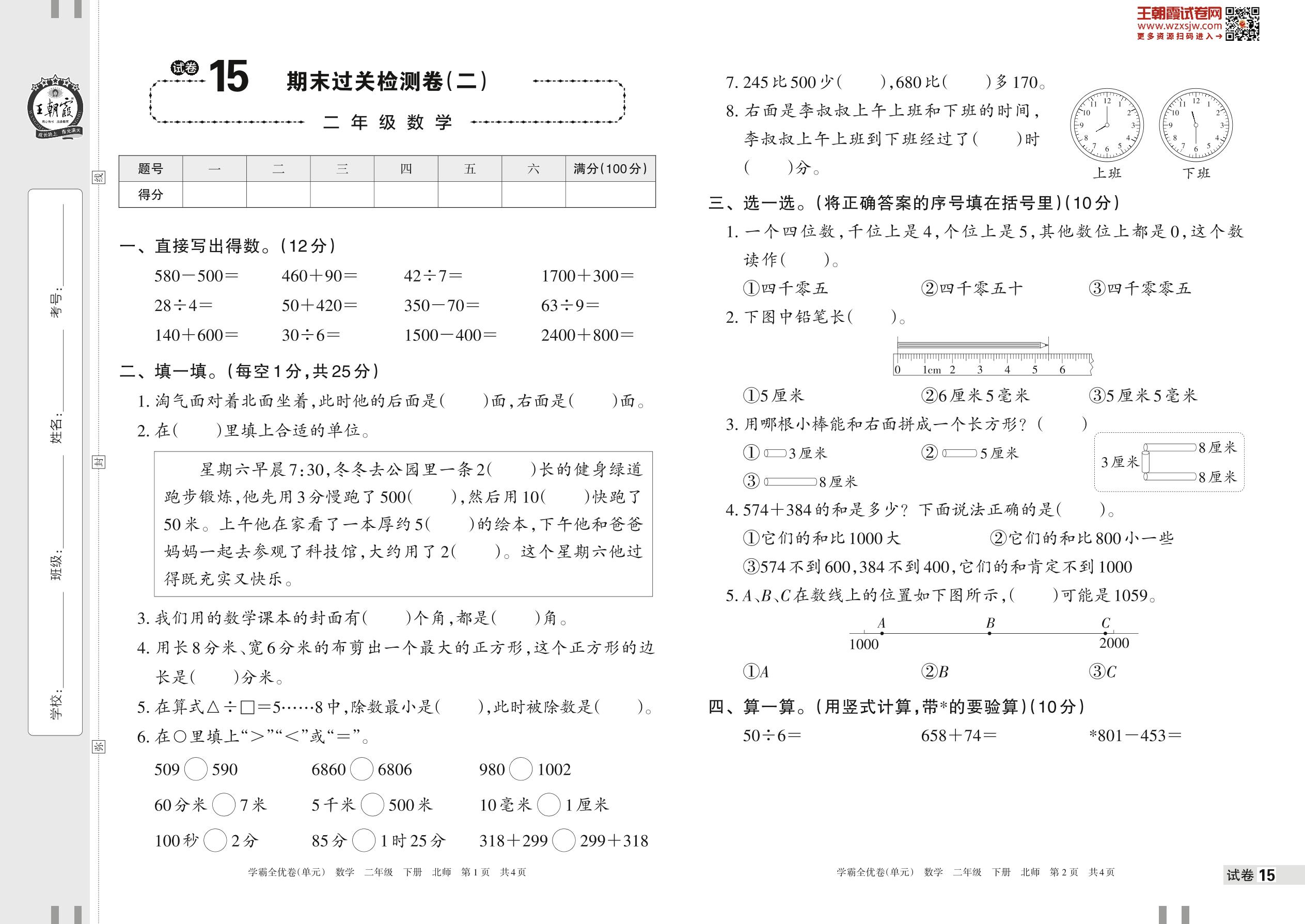 2023下册二年级数学北师版 试卷15 期末过关检测卷(二)