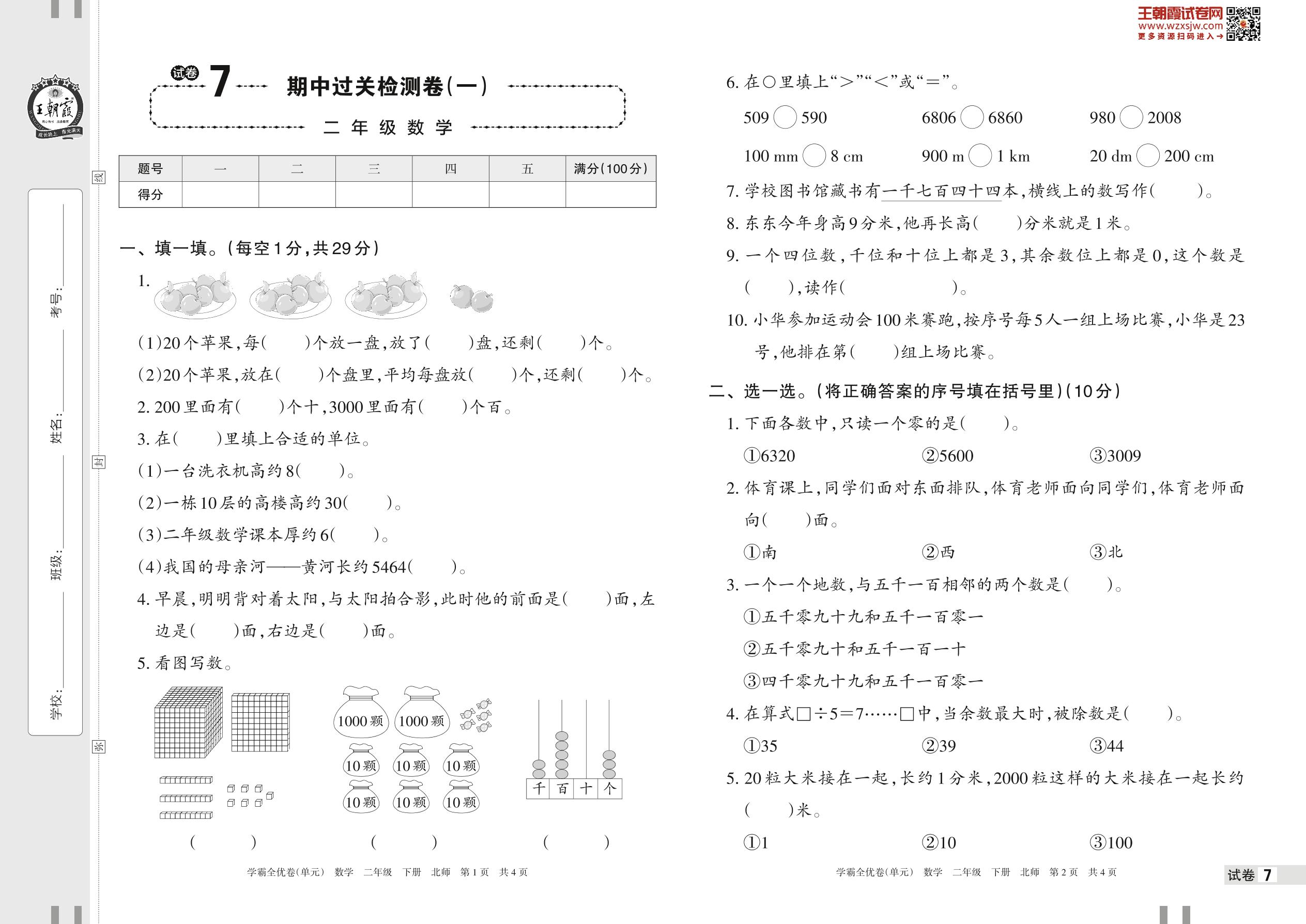2023下册二年级数学北师版 试卷7 期中过关检测卷(一)