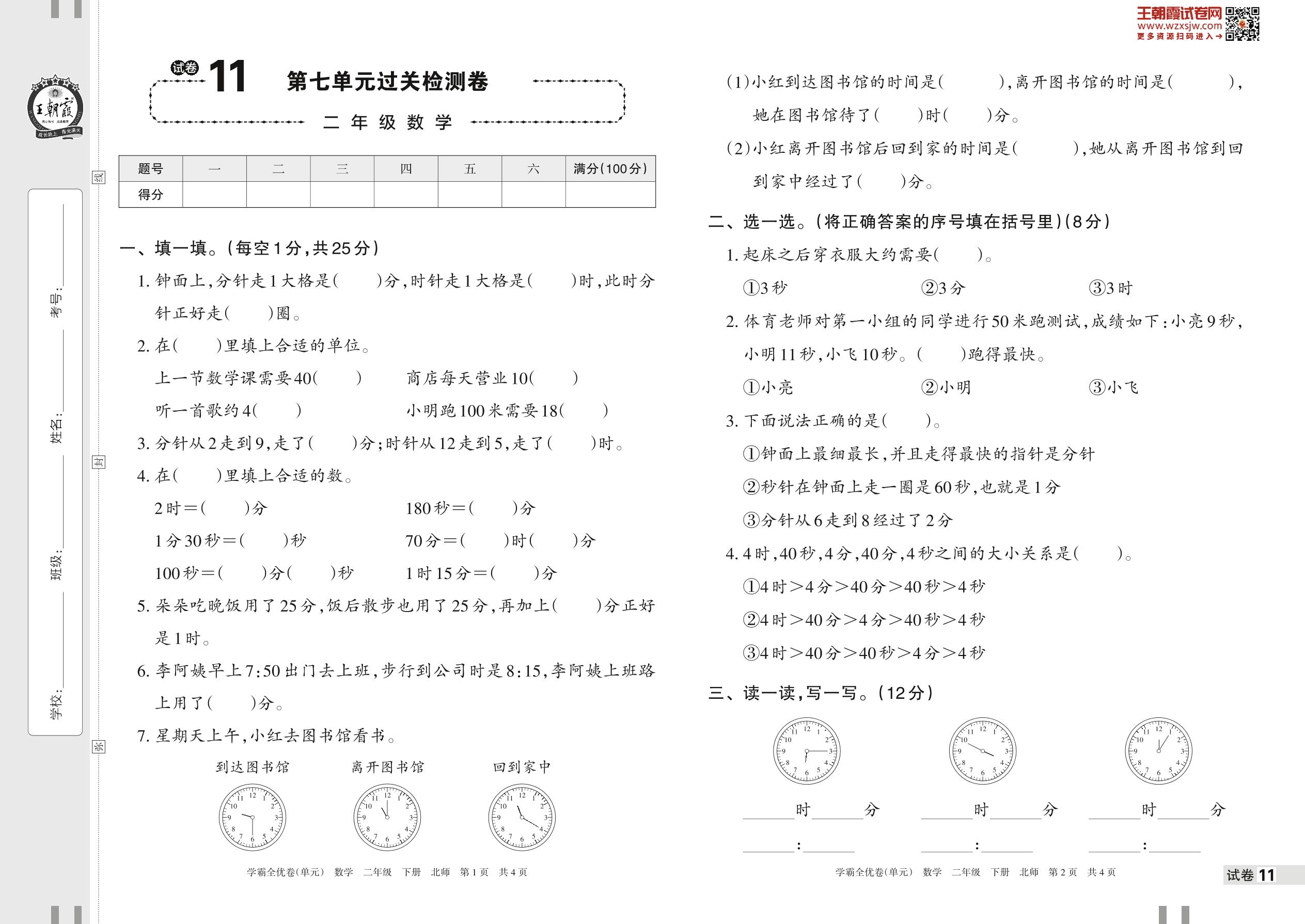 2023下册二年级数学北师版 试卷11 第七单元过关检测卷