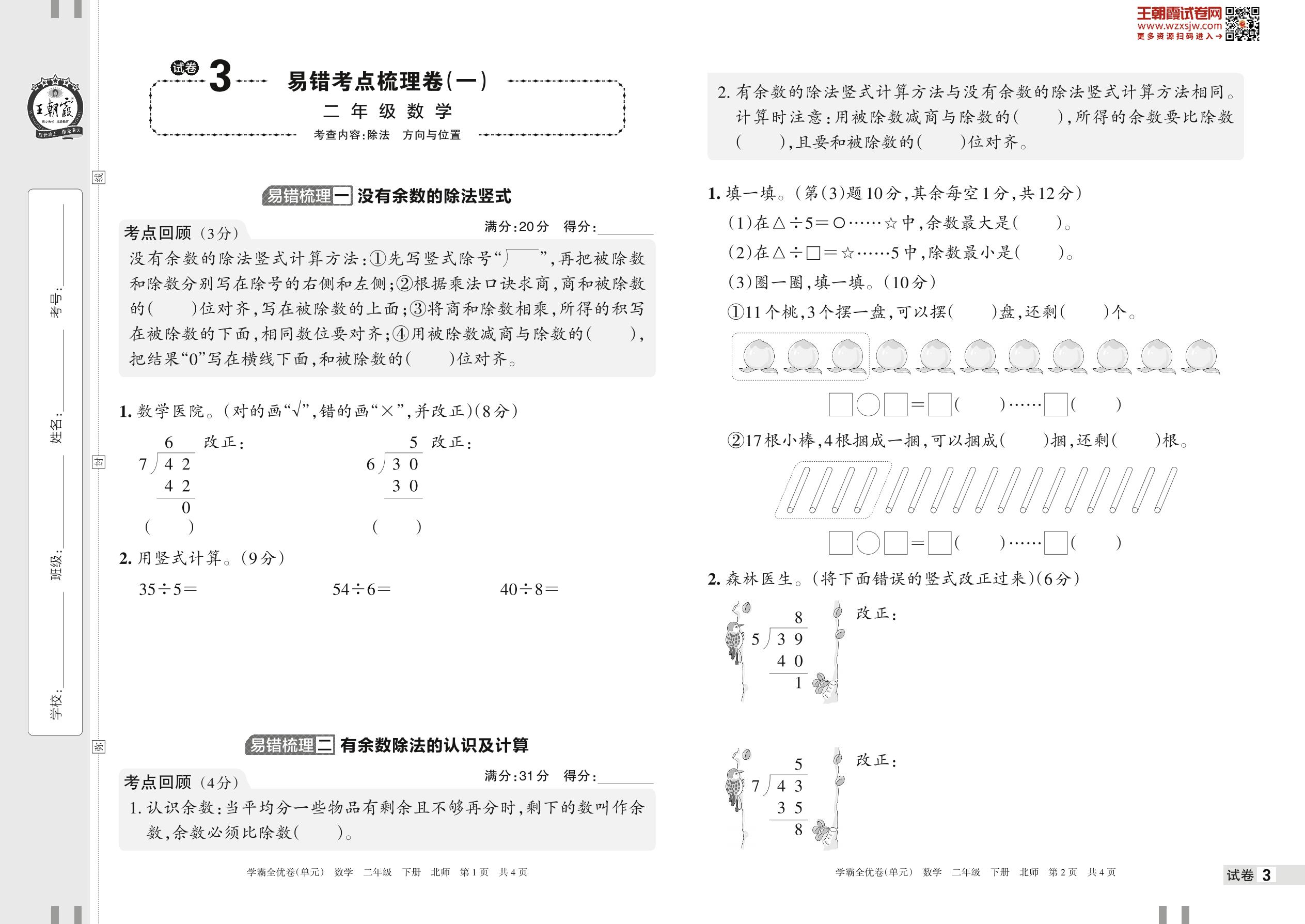 2023下册二年级数学北师版 试卷3 易错考点梳理卷(一)