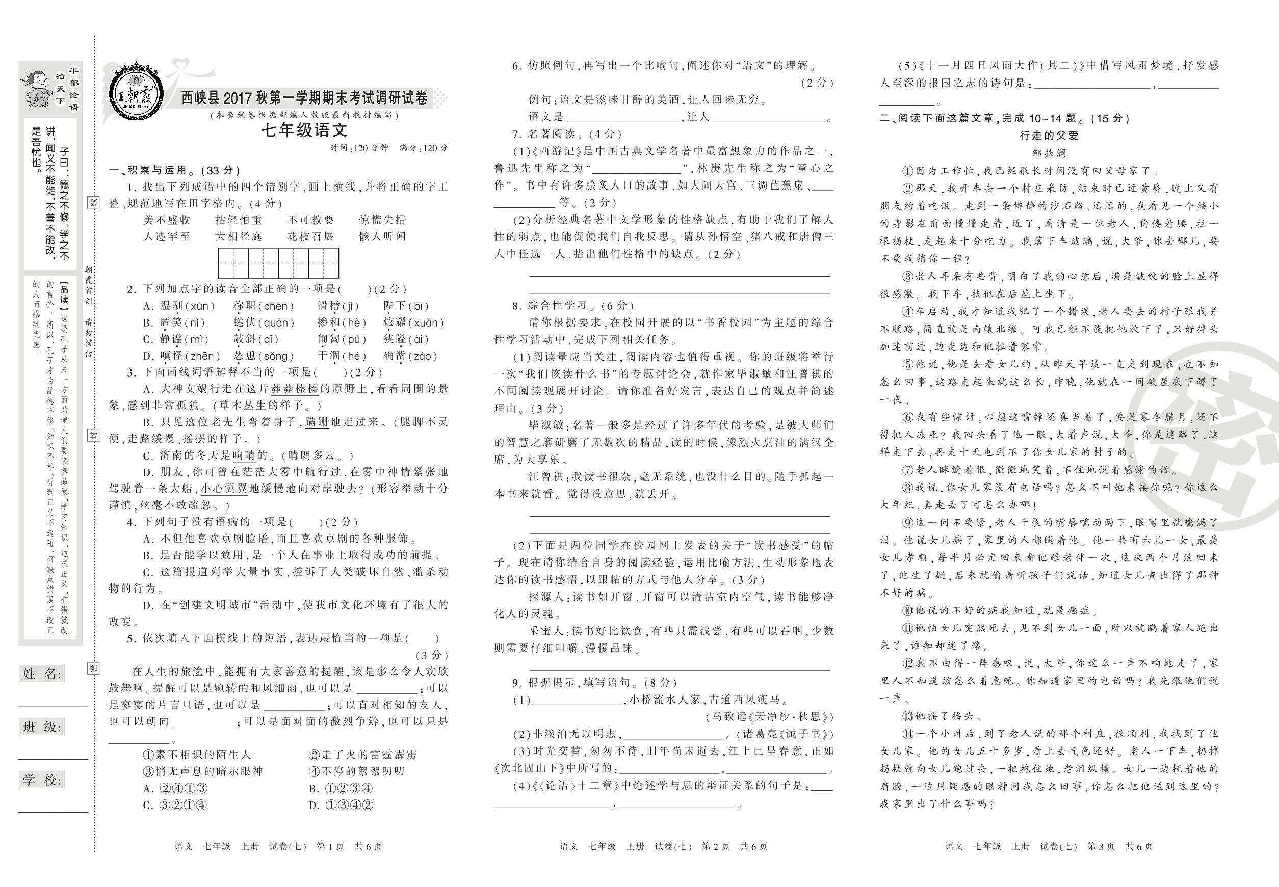 2016-2017学年第一学期南阳市西峡县七年级语文试卷(人教版)【7】