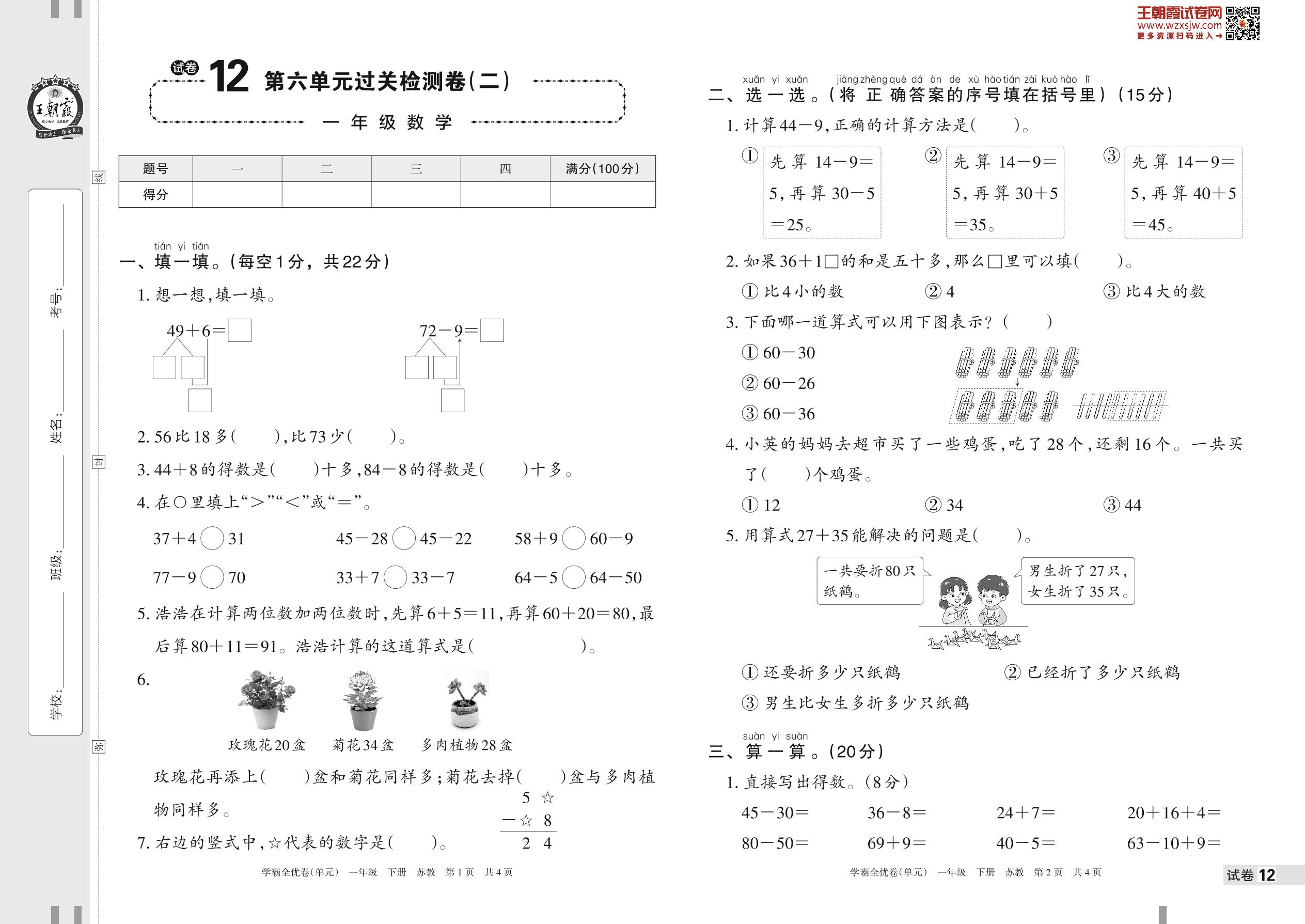 2023下册一年级数学苏教版 试卷12 第六单元过关检测卷(二)