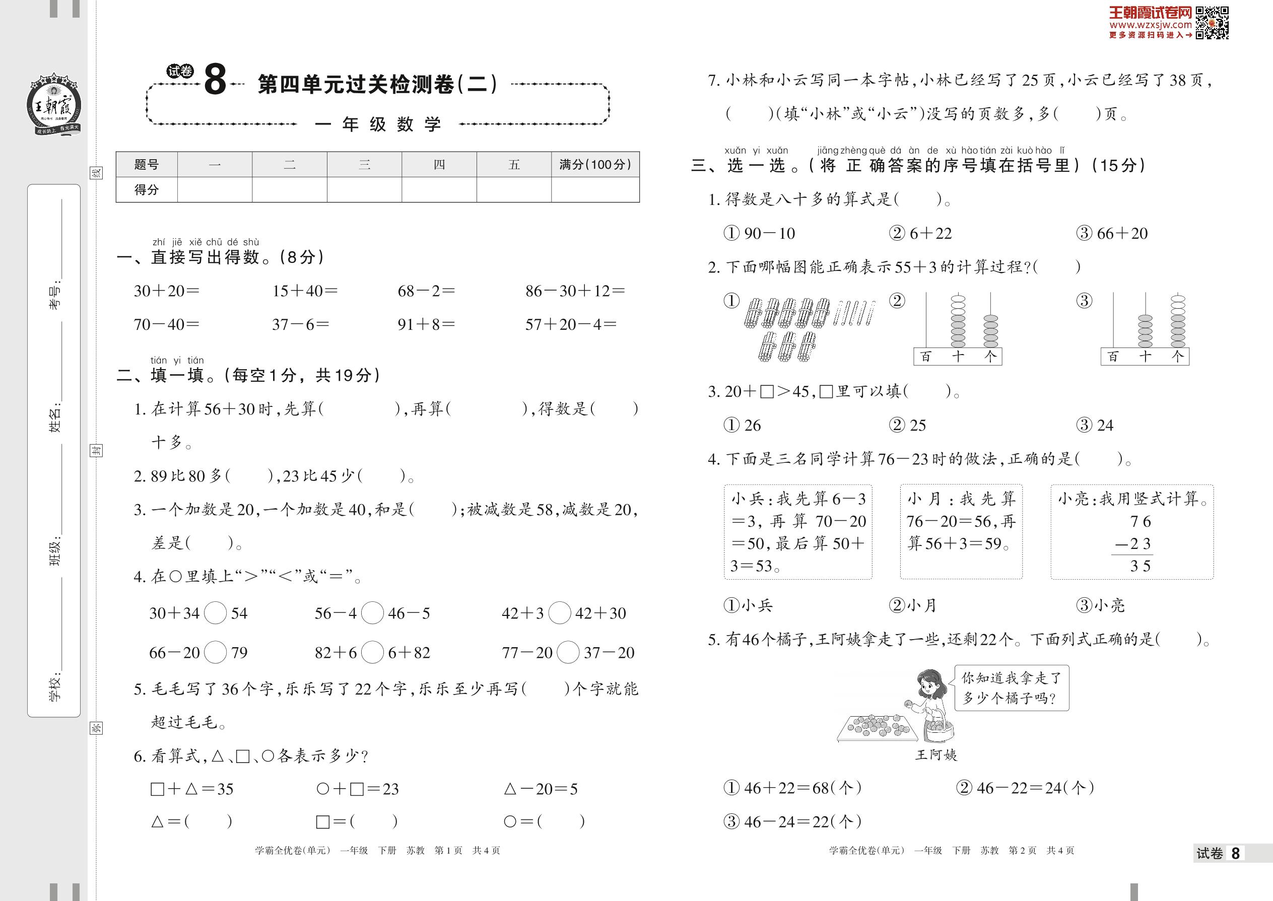 2023下册一年级数学苏教版 试卷8 第四单元过关检测卷(二)