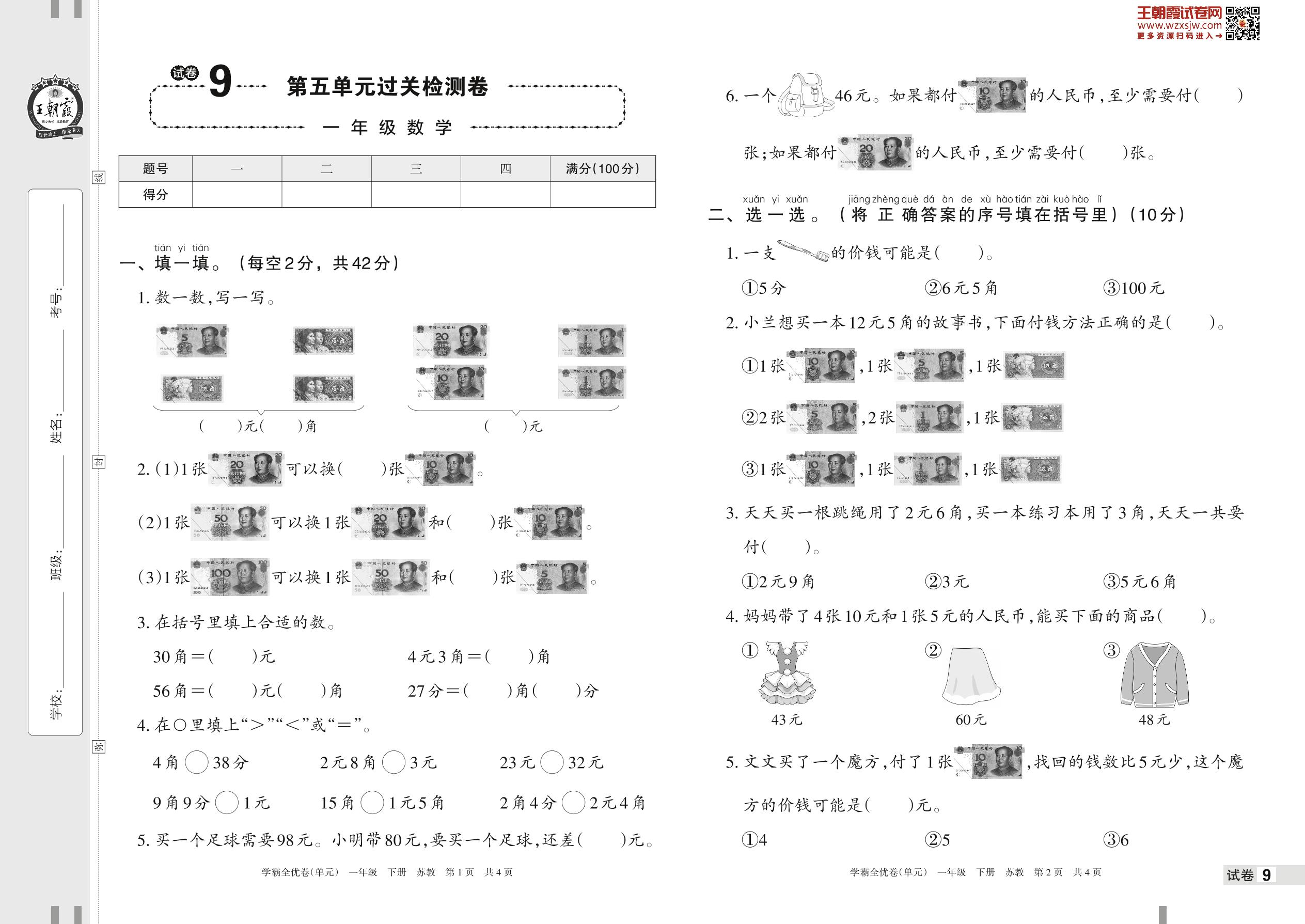 2023下册一年级数学苏教版 试卷9 第五单元过关检测卷