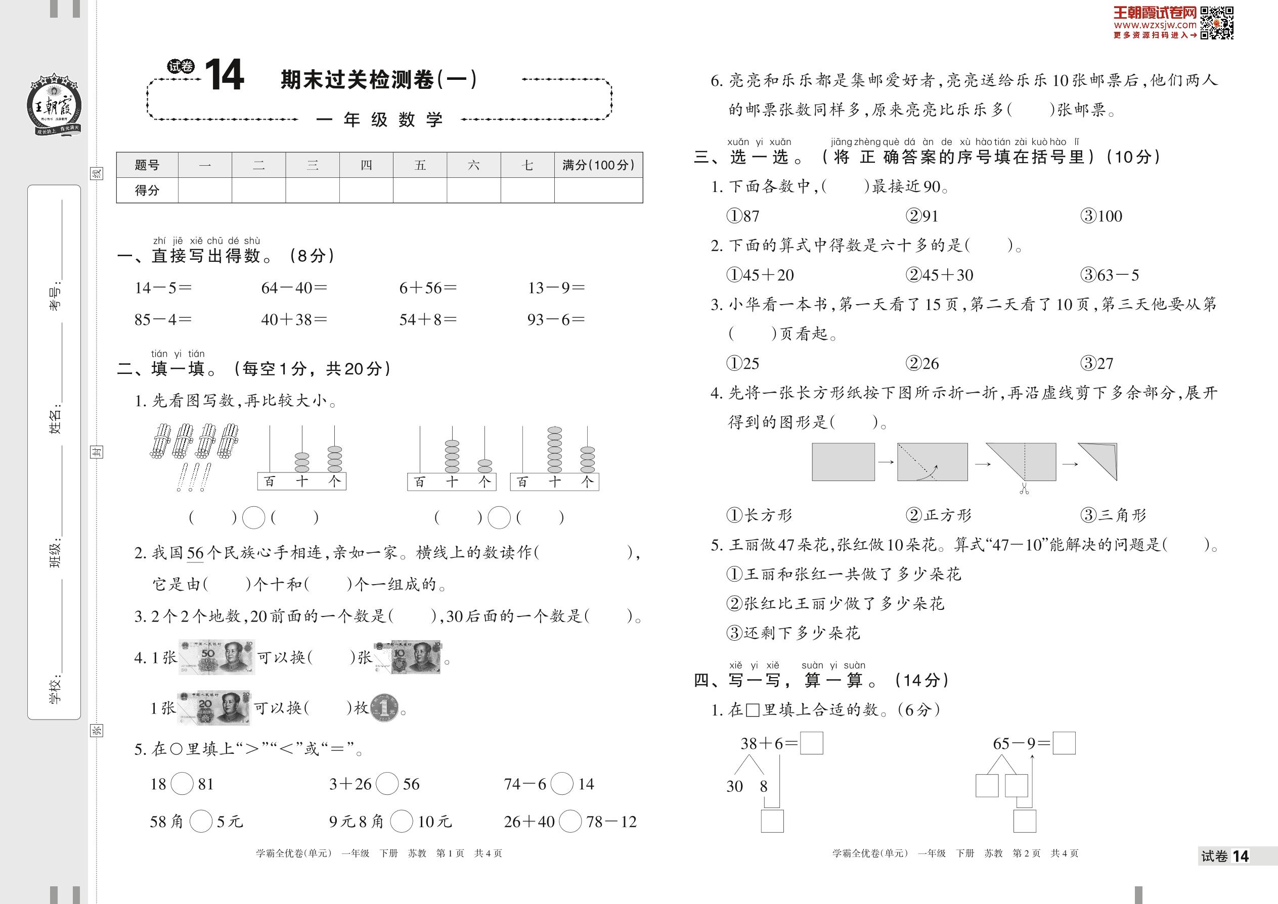 2023下册一年级数学苏教版 试卷14 期末过关检测卷(一)