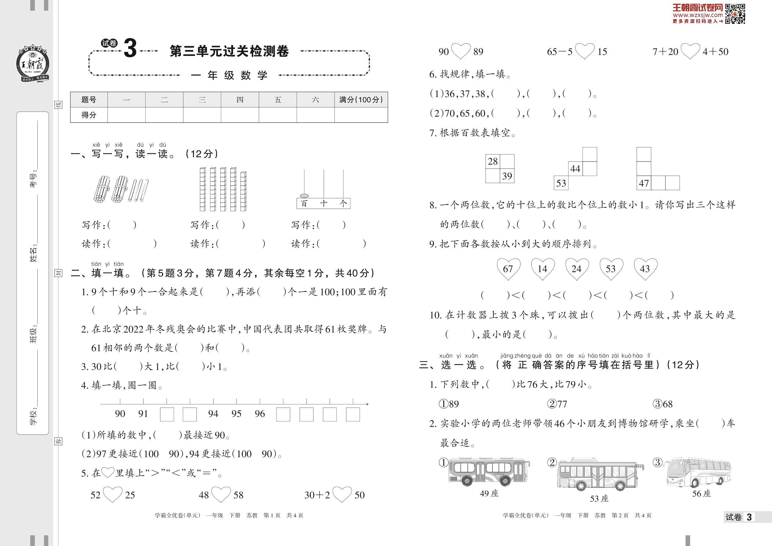 2023下册一年级数学苏教版 试卷3 第三单元过关检测卷