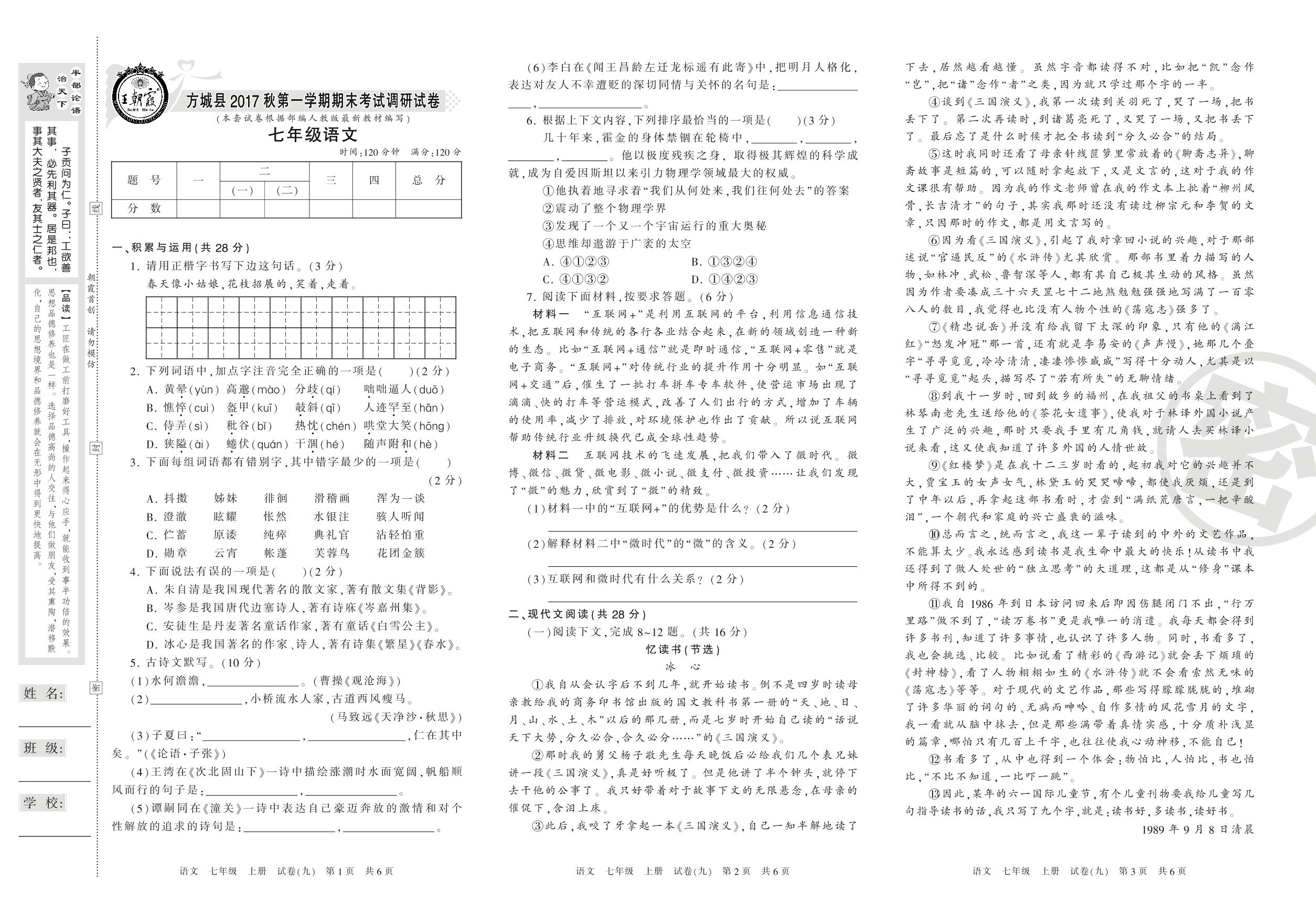 2016-2017学年第一学期南阳市方城县七年级语文试卷(人教版)【9】