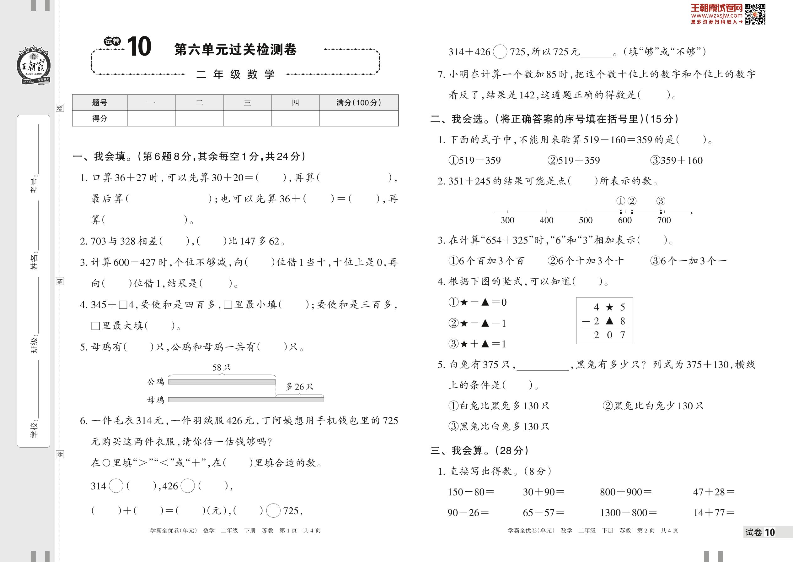 2023下册二年级数学苏教版 试卷10 第六单元过关检测卷