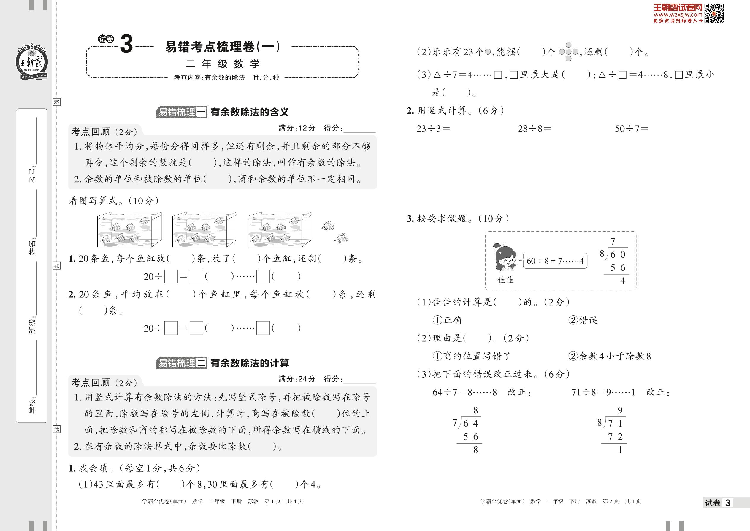 2023下册二年级数学苏教版 试卷3 易错考点梳理卷(一)