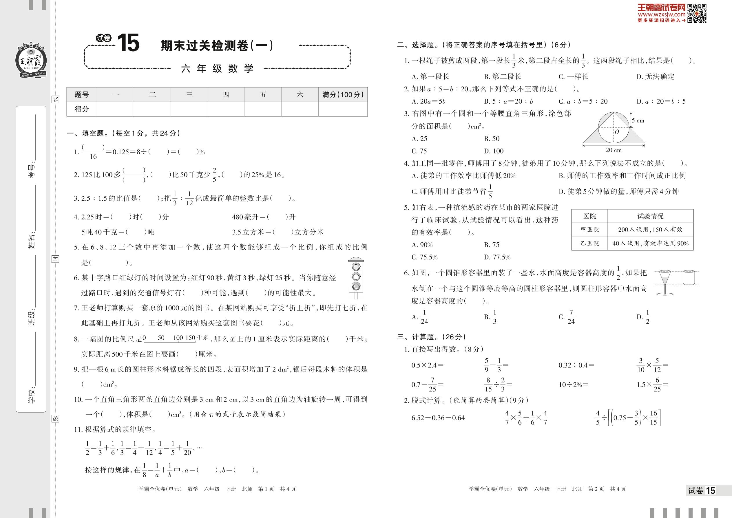 2023下册六年级数学北师版 试卷15 期末过关检测卷(一)