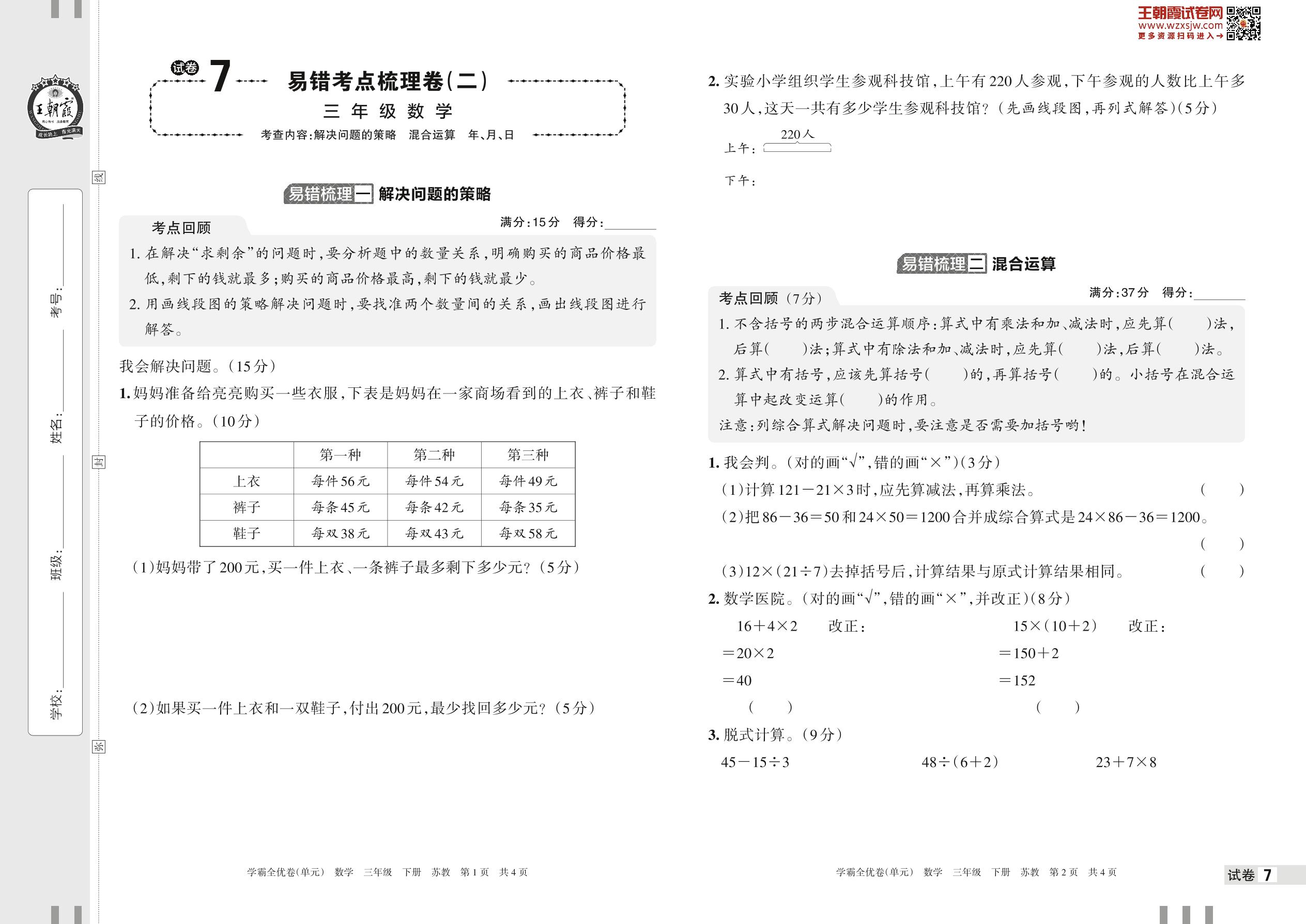 2023下册三年级数学苏教版 试卷7 易错考点梳理卷(二)