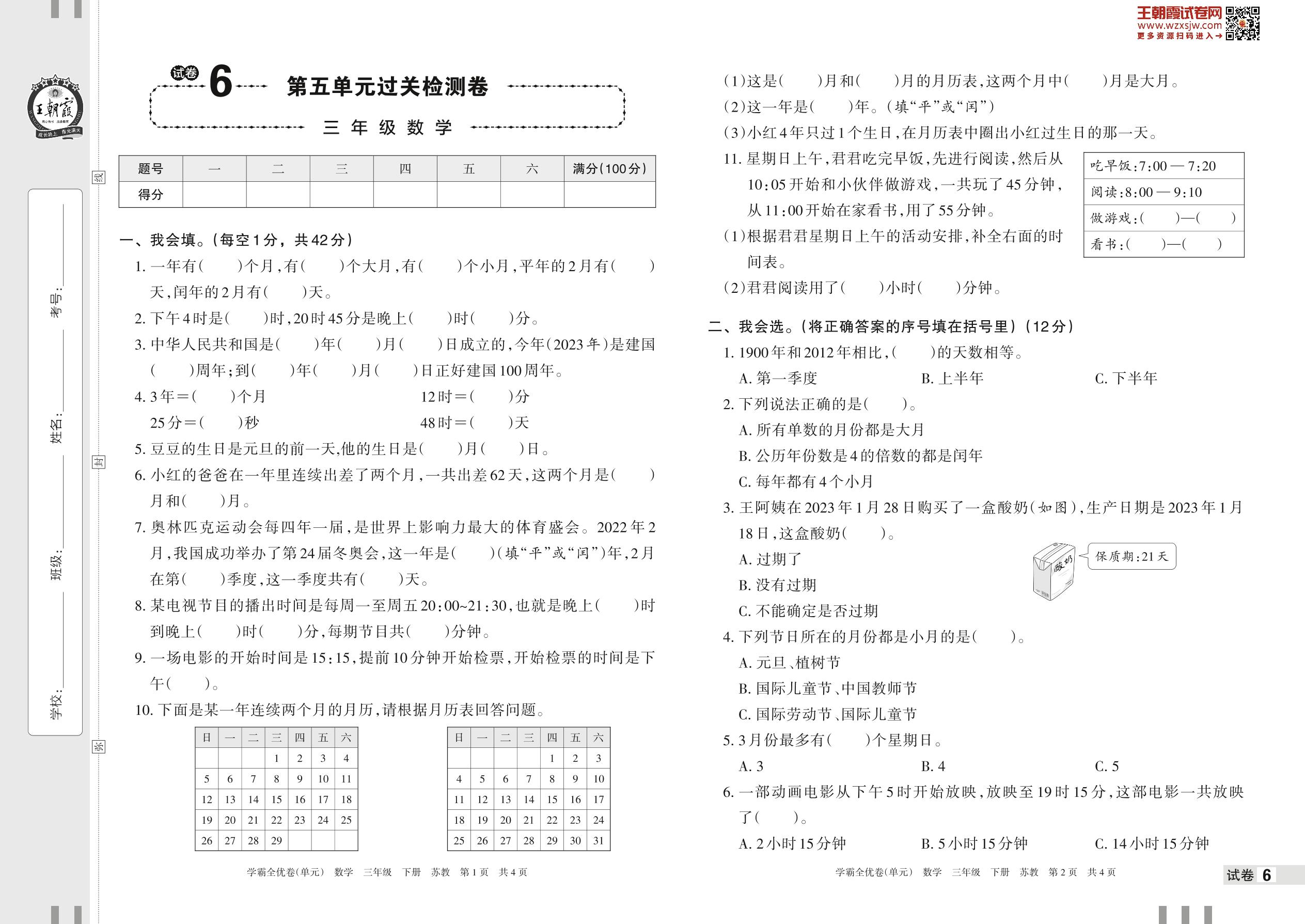 2023下册三年级数学苏教版 试卷6 第五单元过关检测卷