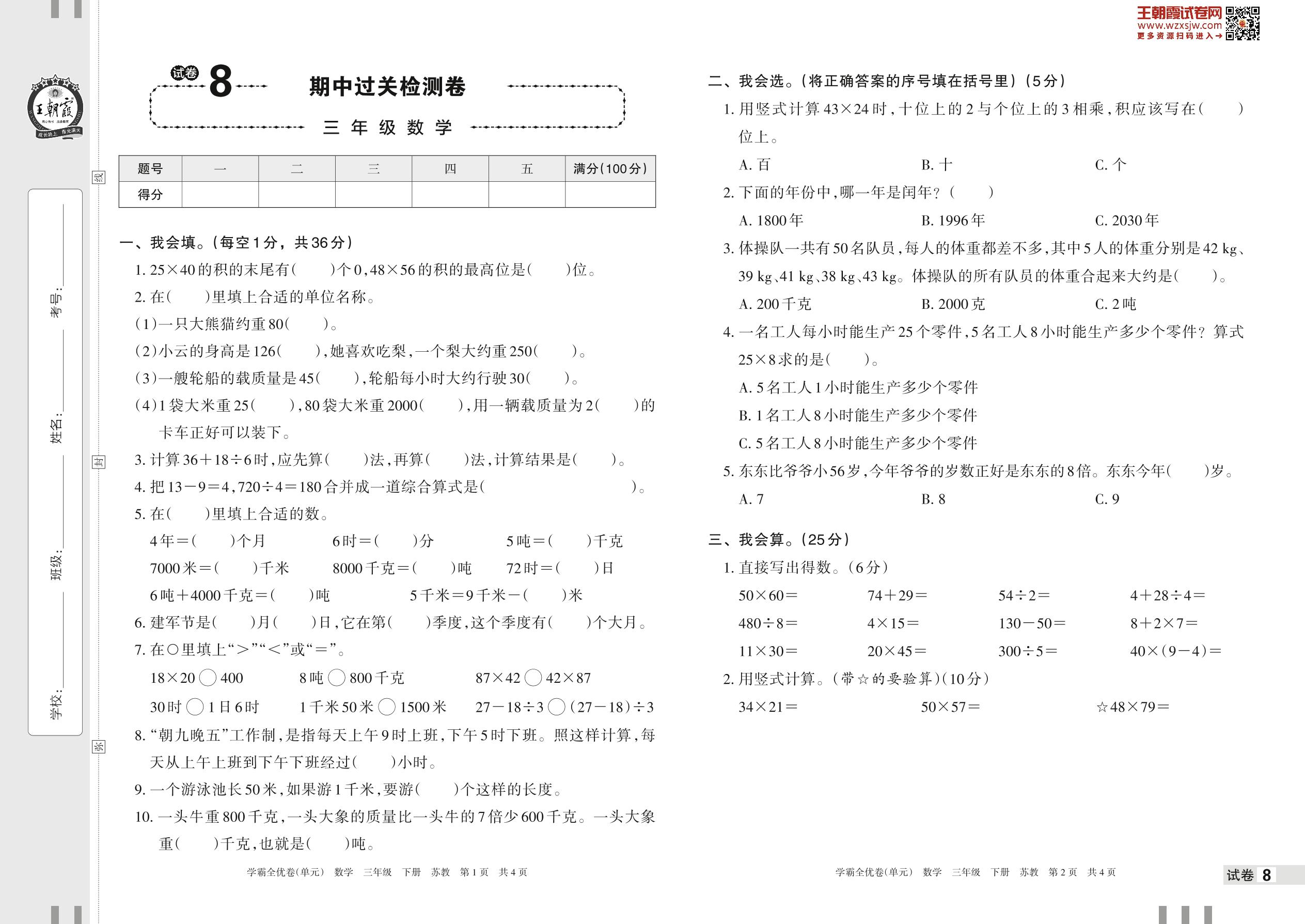 2023下册三年级数学苏教版 试卷8 期中过关检测卷