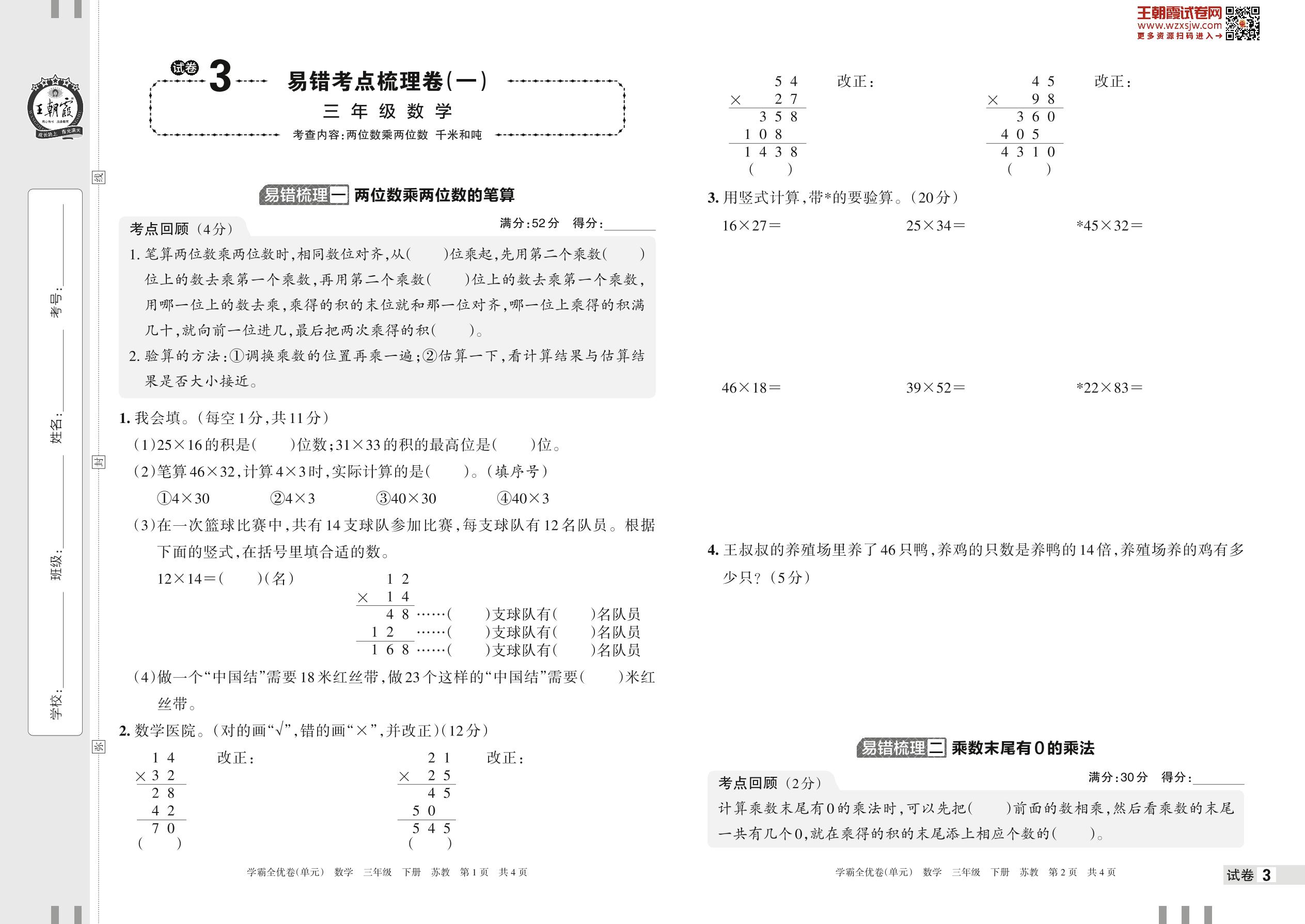 2023下册三年级数学苏教版 试卷3 易错考点梳理卷(一)