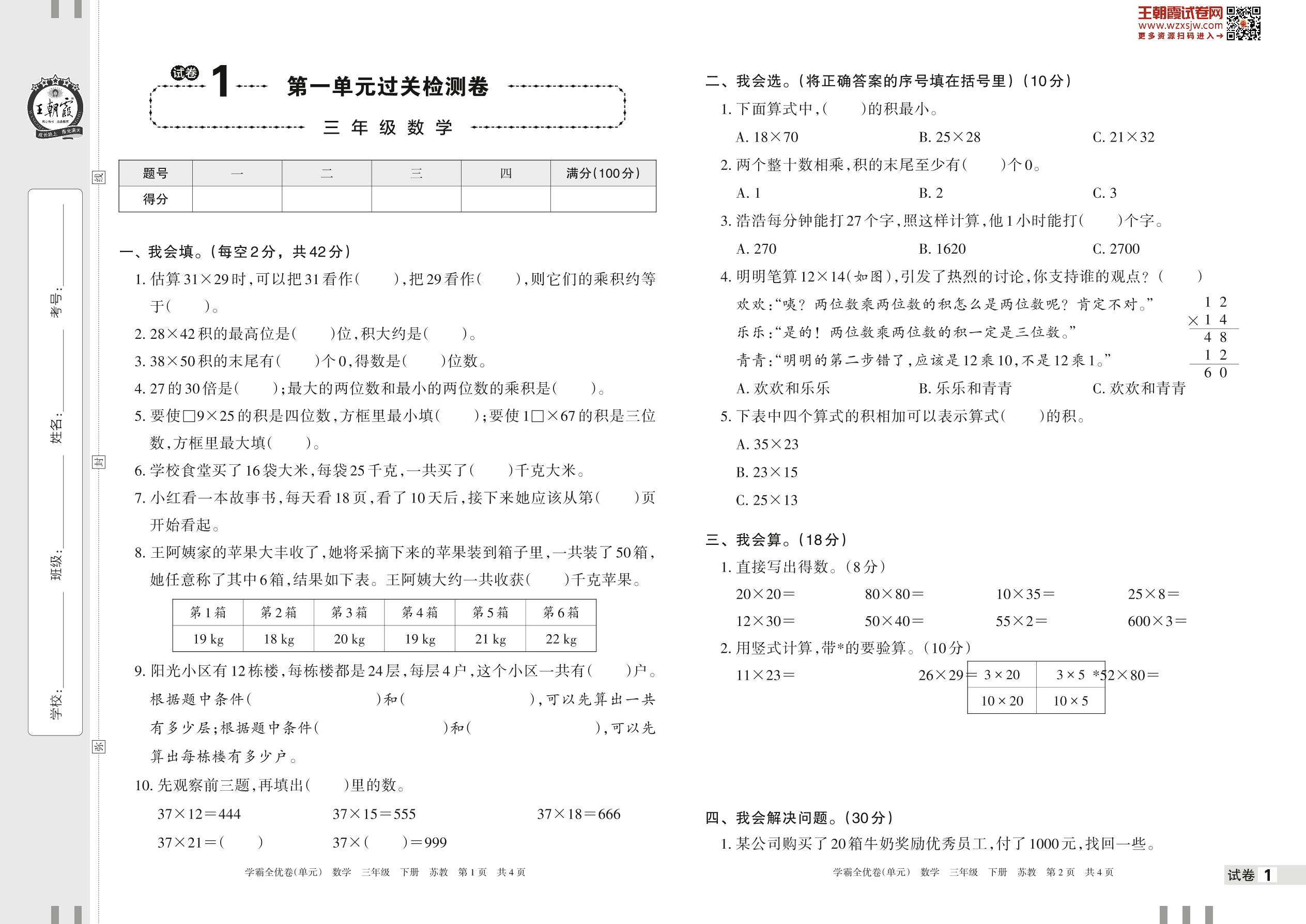 2023下册三年级数学苏教版 试卷1 第一单元过关检测卷