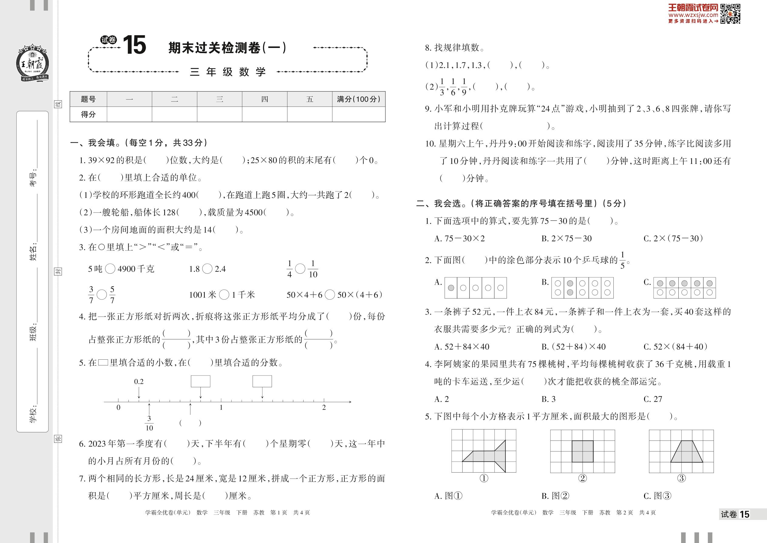 2023下册三年级数学苏教版 试卷15 期末过关检测卷(一)