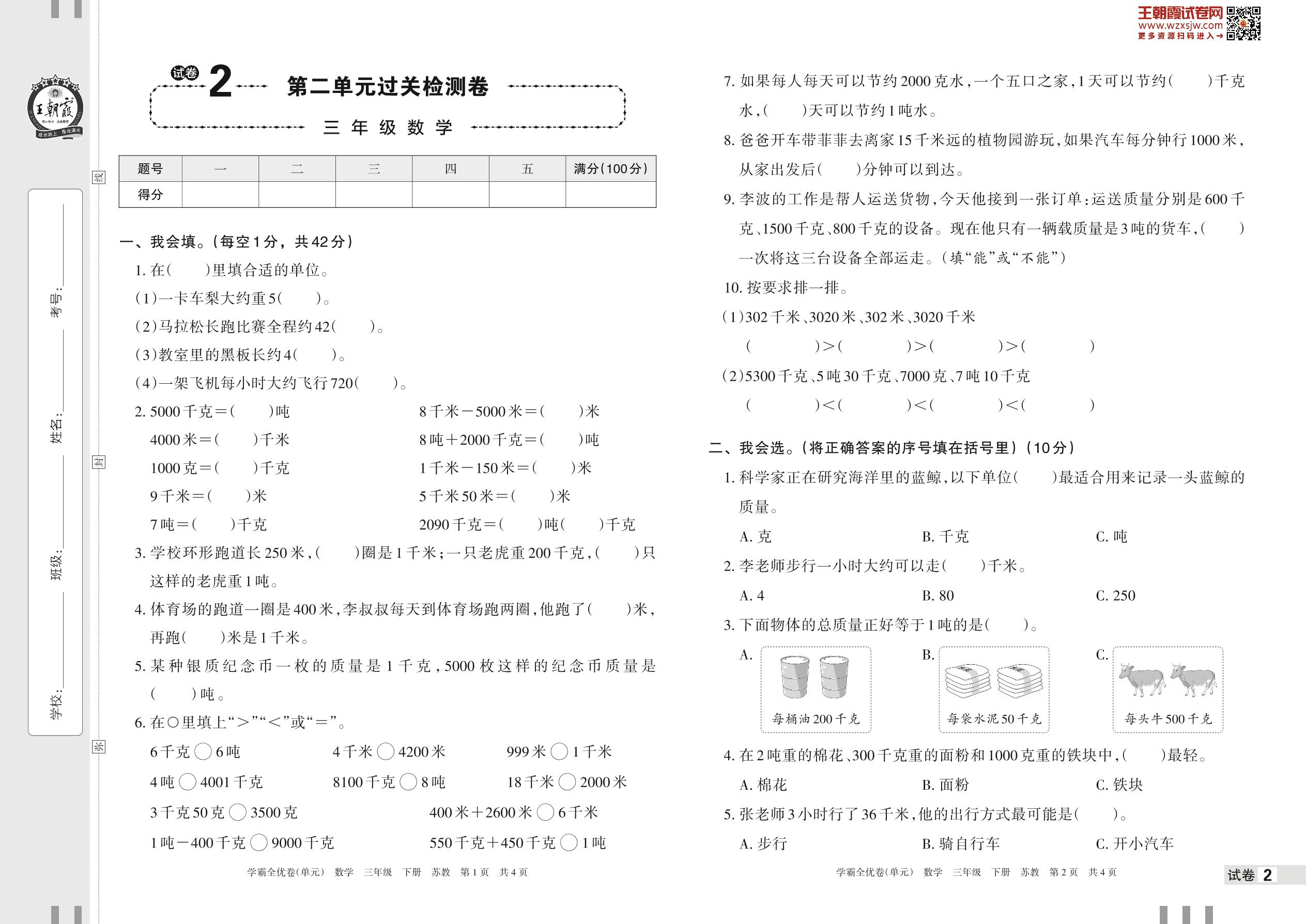 2023下册三年级数学苏教版 试卷2 第二单元过关检测卷