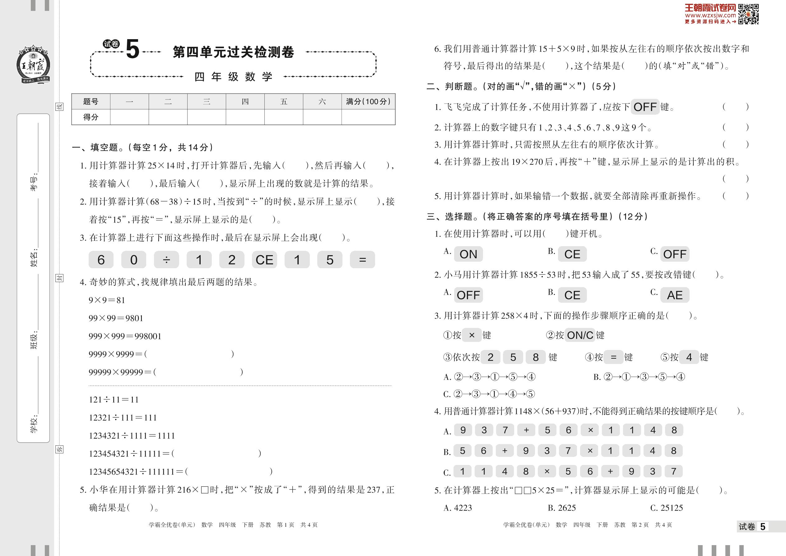 2023下册四年级数学苏教版 试卷5 第四单元过关检测卷