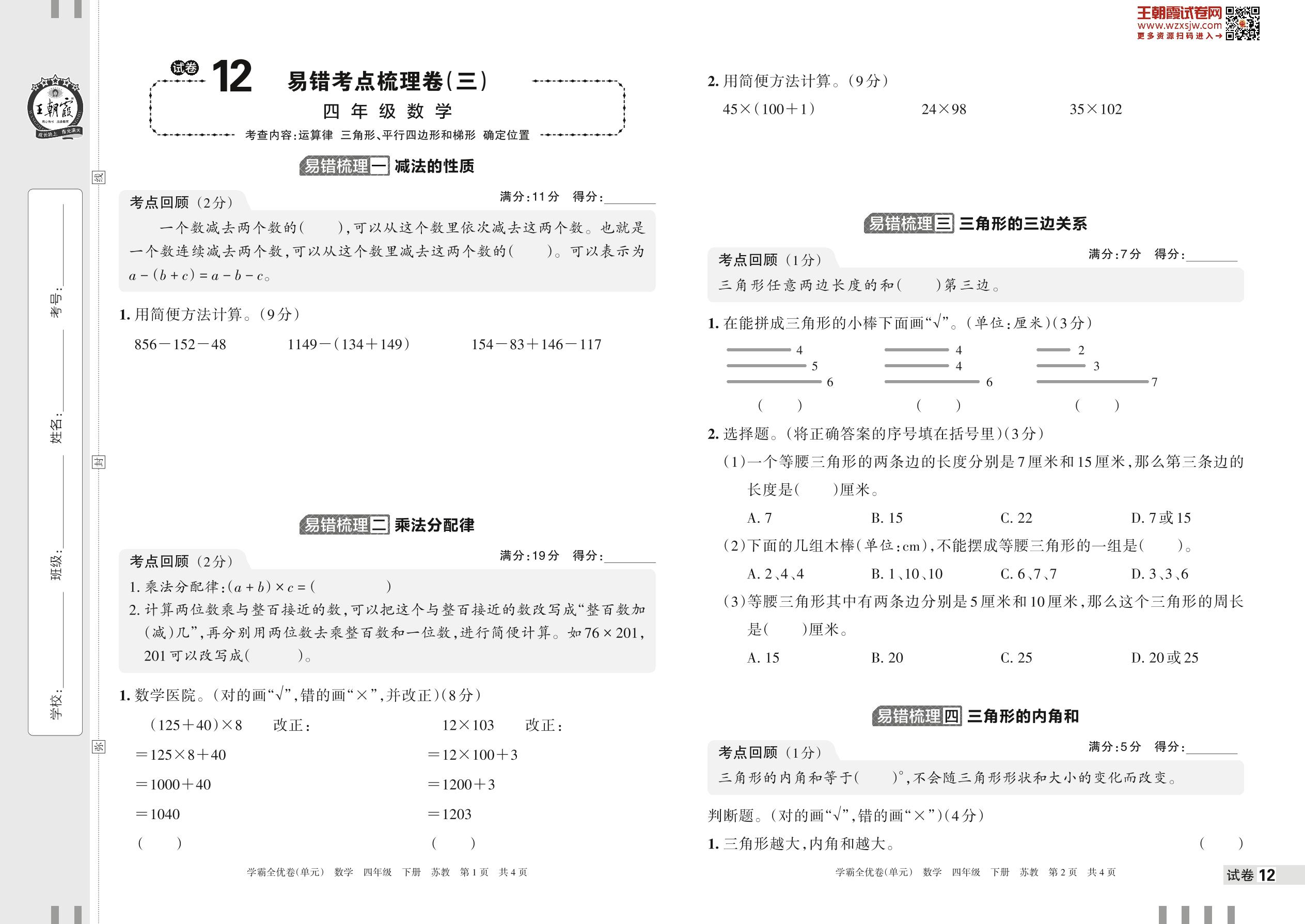 2023下册四年级数学苏教版 试卷12 易错考点梳理卷(三)