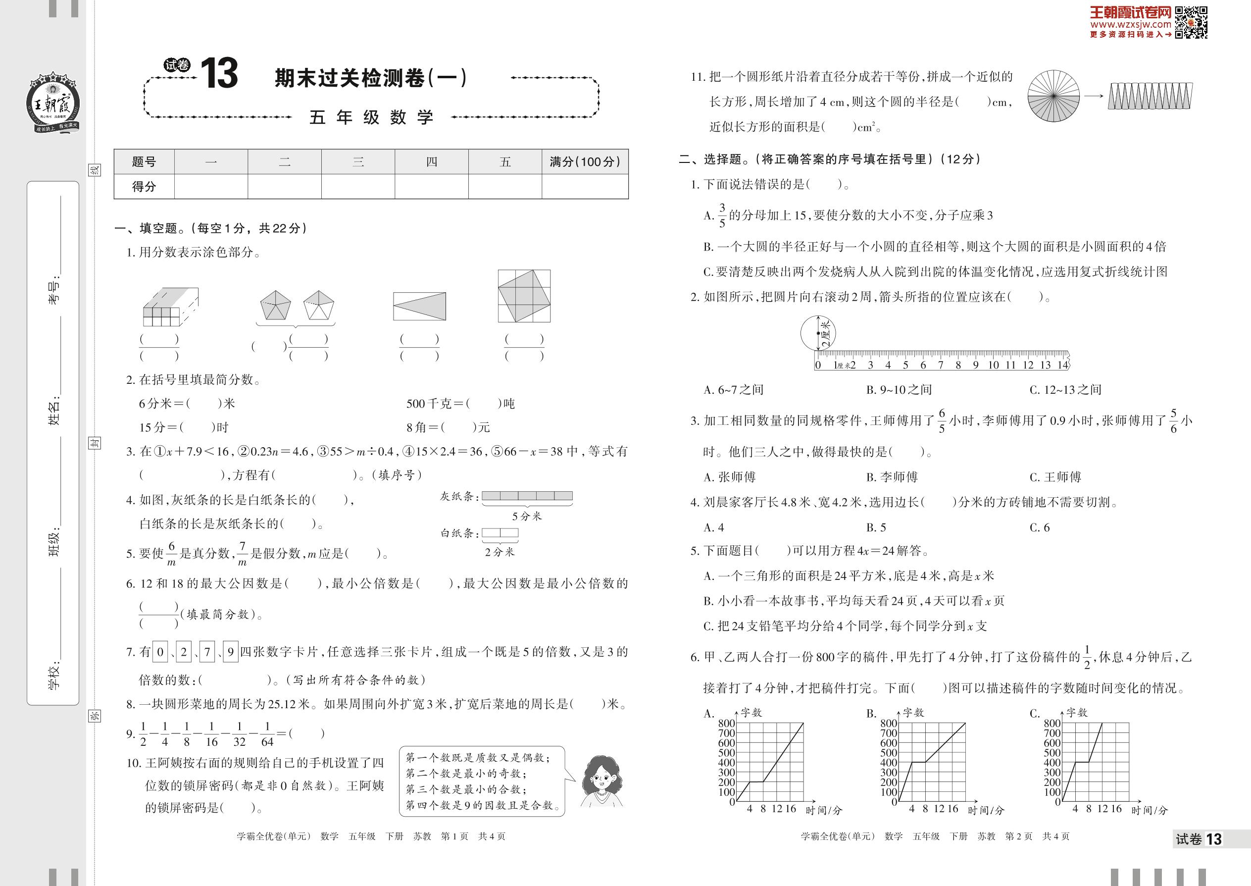 2023下册五年级数学苏教版 试卷13 期末过关检测卷(一)