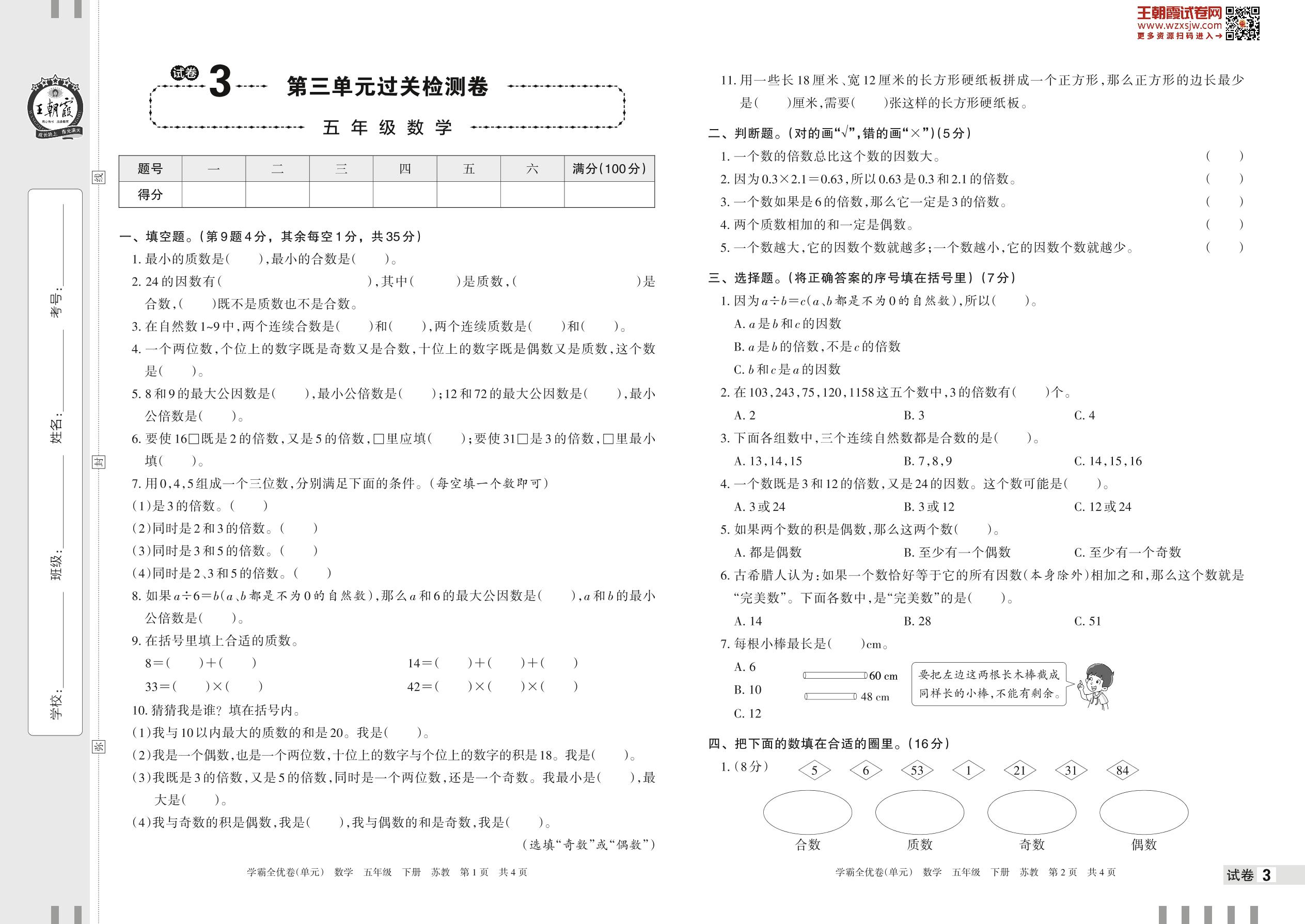 2023下册五年级数学苏教版 试卷3 第三单元过关检测卷