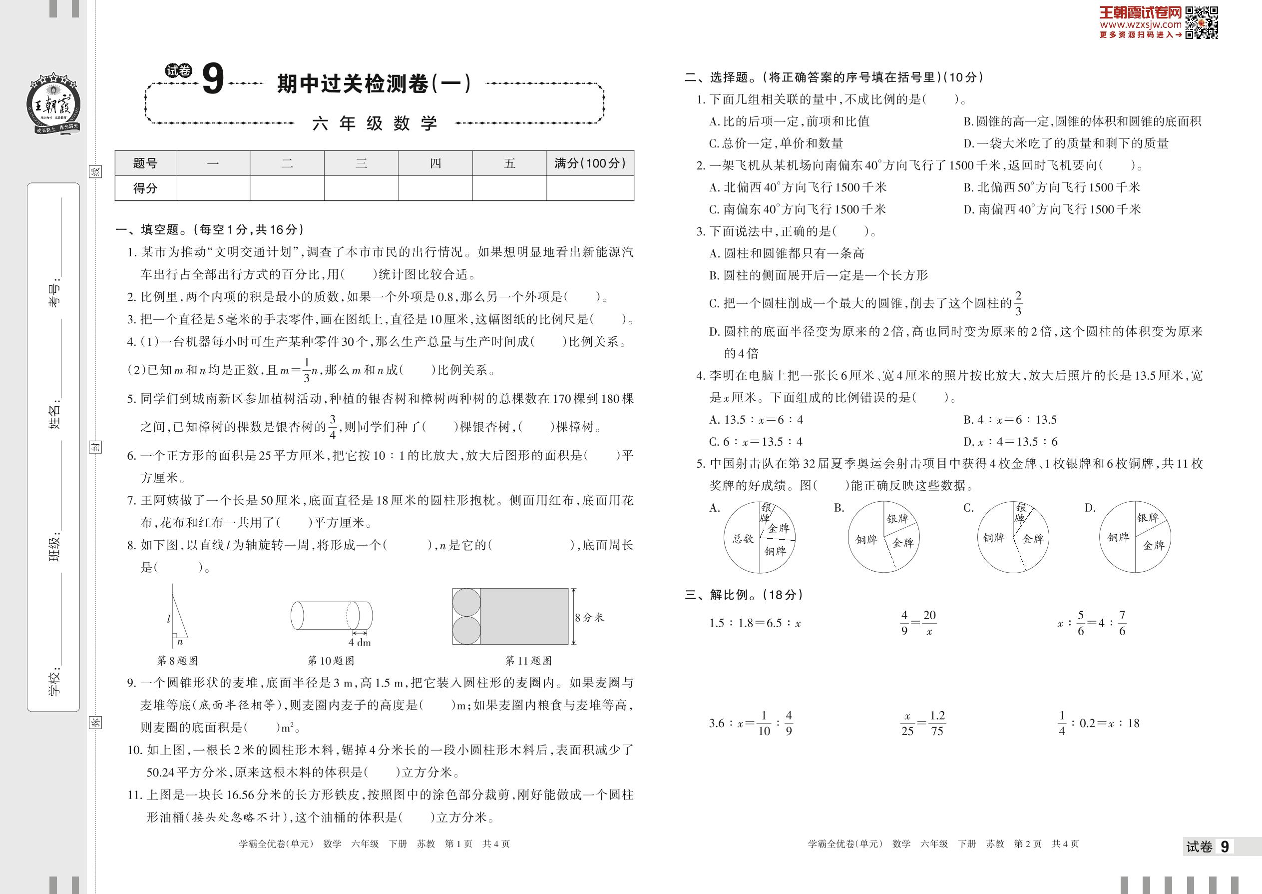 2023下册六年级数学苏教版 试卷9 期中过关检测卷(一)