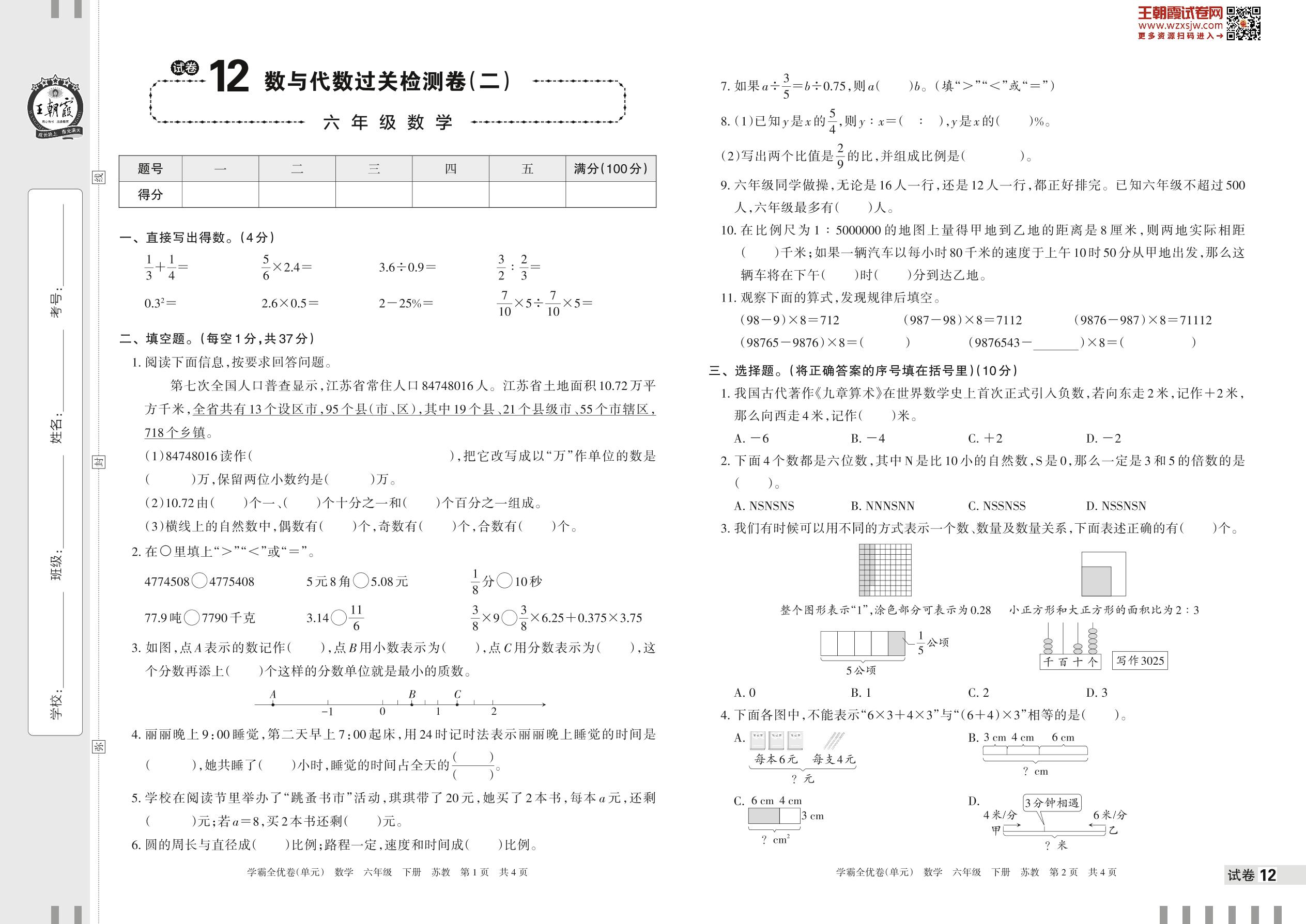 2023下册六年级数学苏教版 试卷12 数与代数过关检测卷(二)