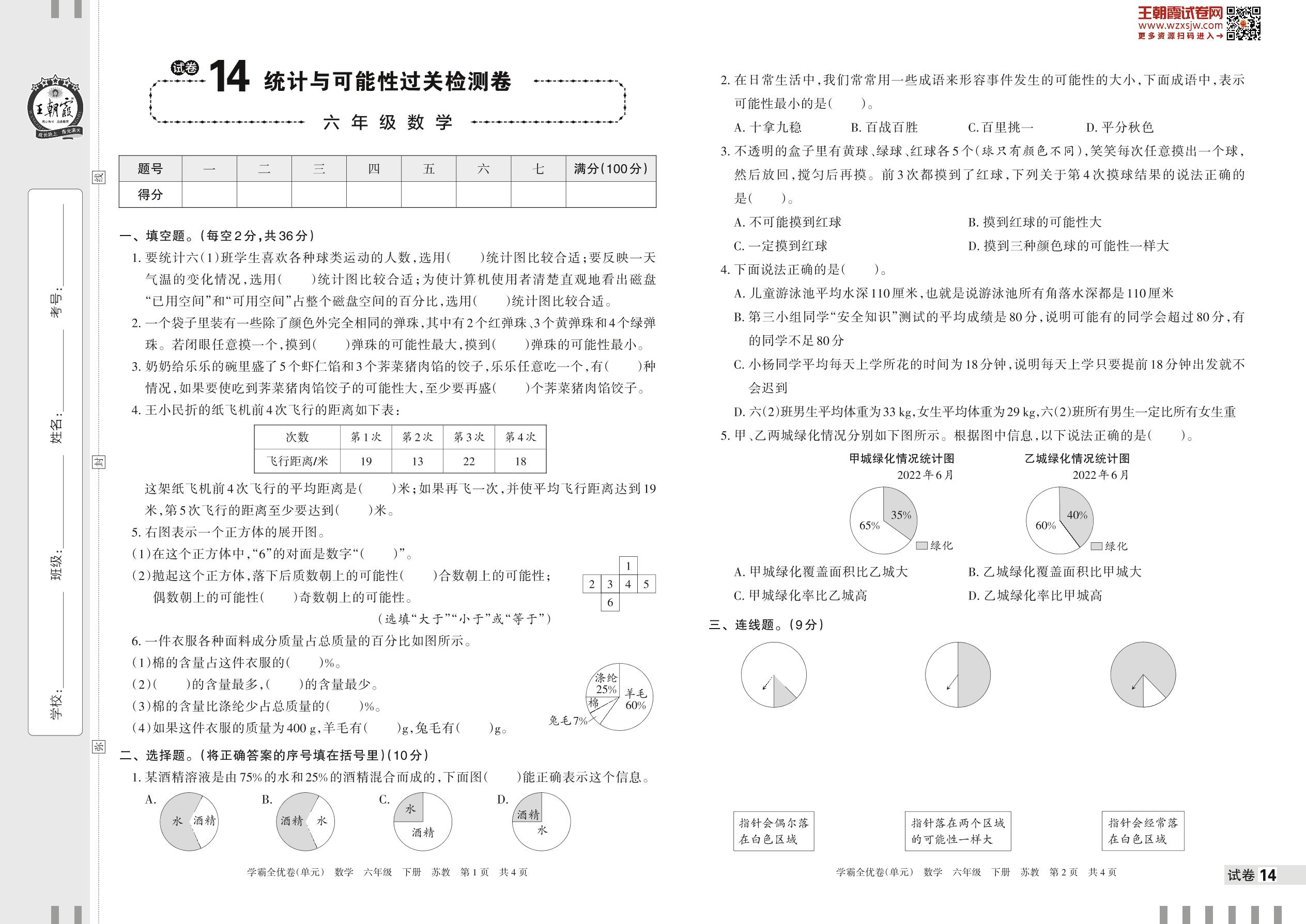 2023下册六年级数学苏教版 试卷14 统计与可能性过关检测卷