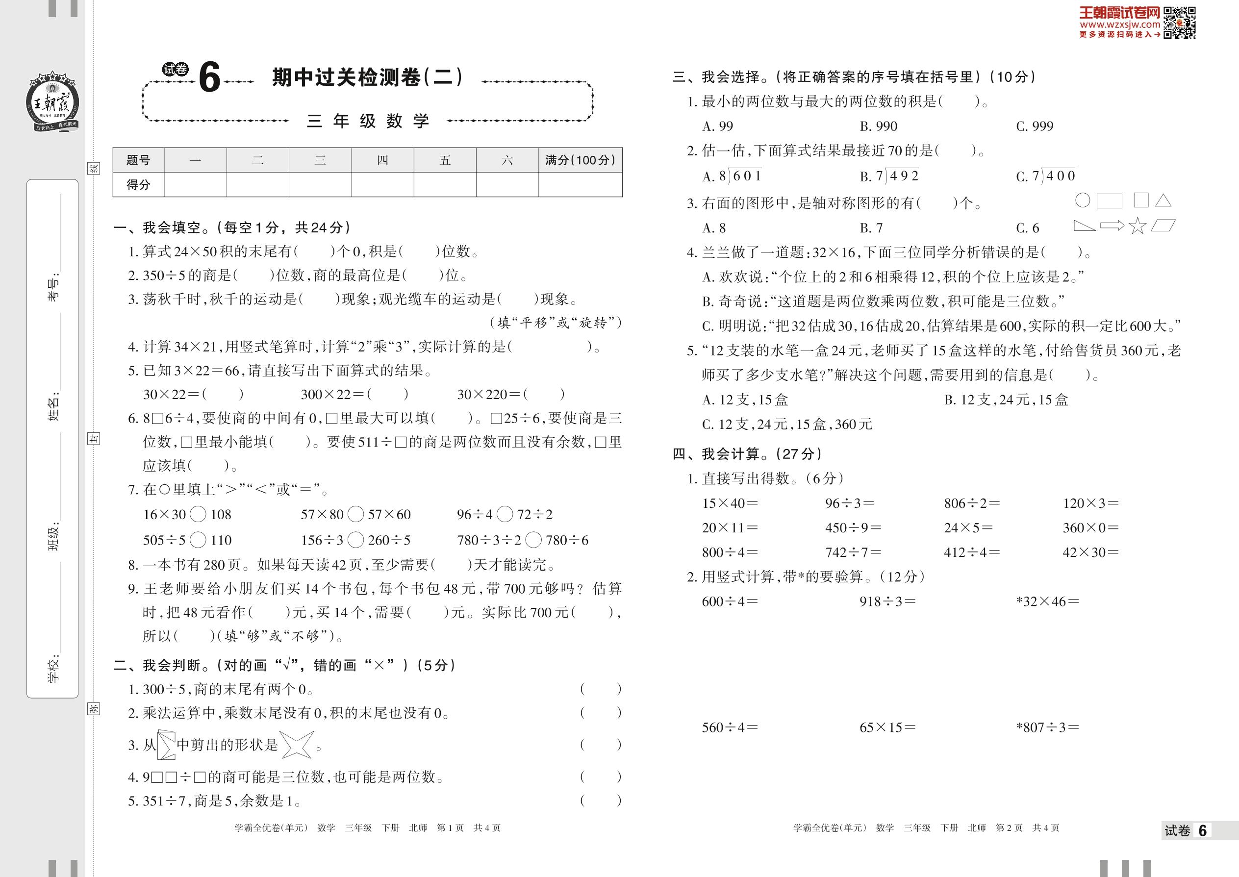 2023下册三年级数学北师版 试卷6 期中过关检测卷(二)