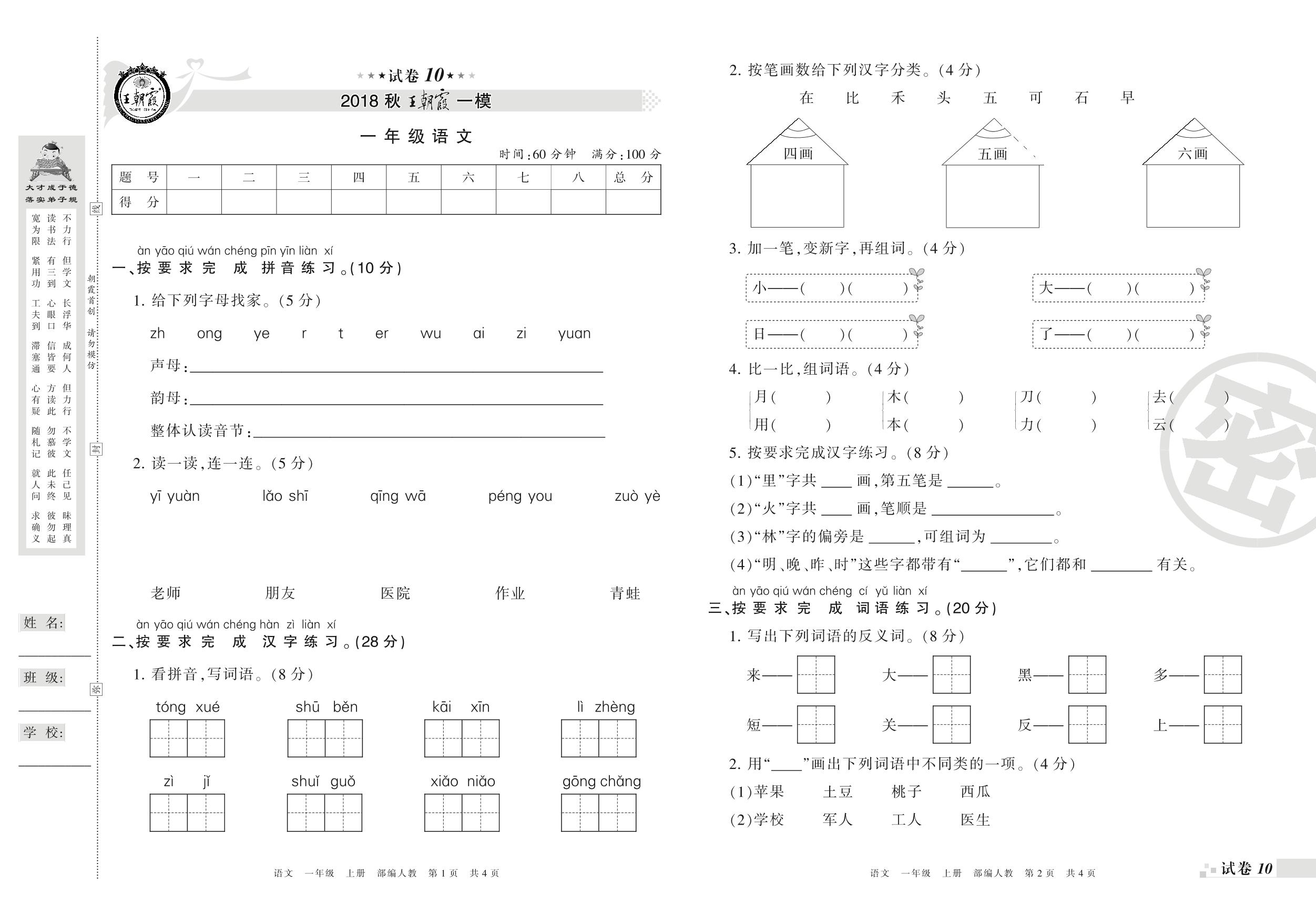 王朝霞期末模拟卷一年级上册语文(人教版)_R210731185148【10】