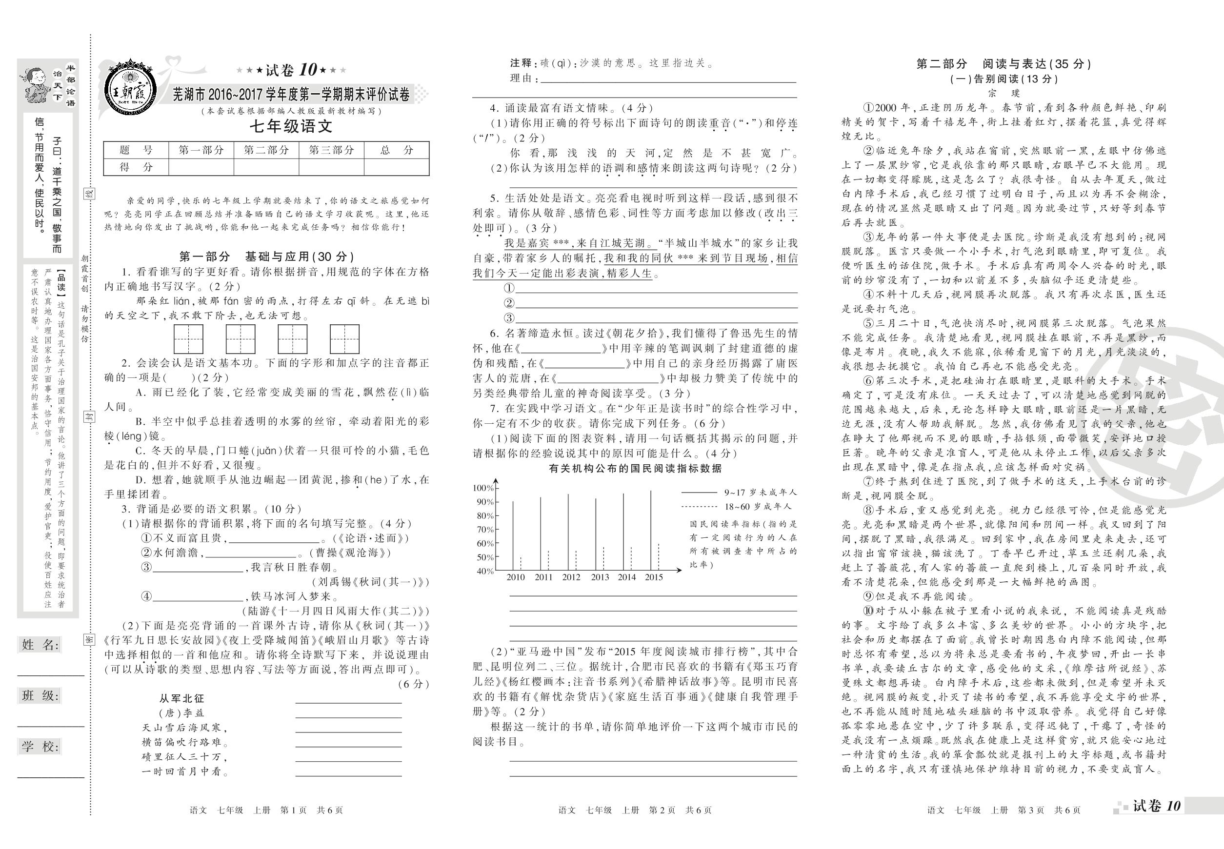 2016-2017学年第一学期芜湖市七年级语文试卷(人教版)【10】