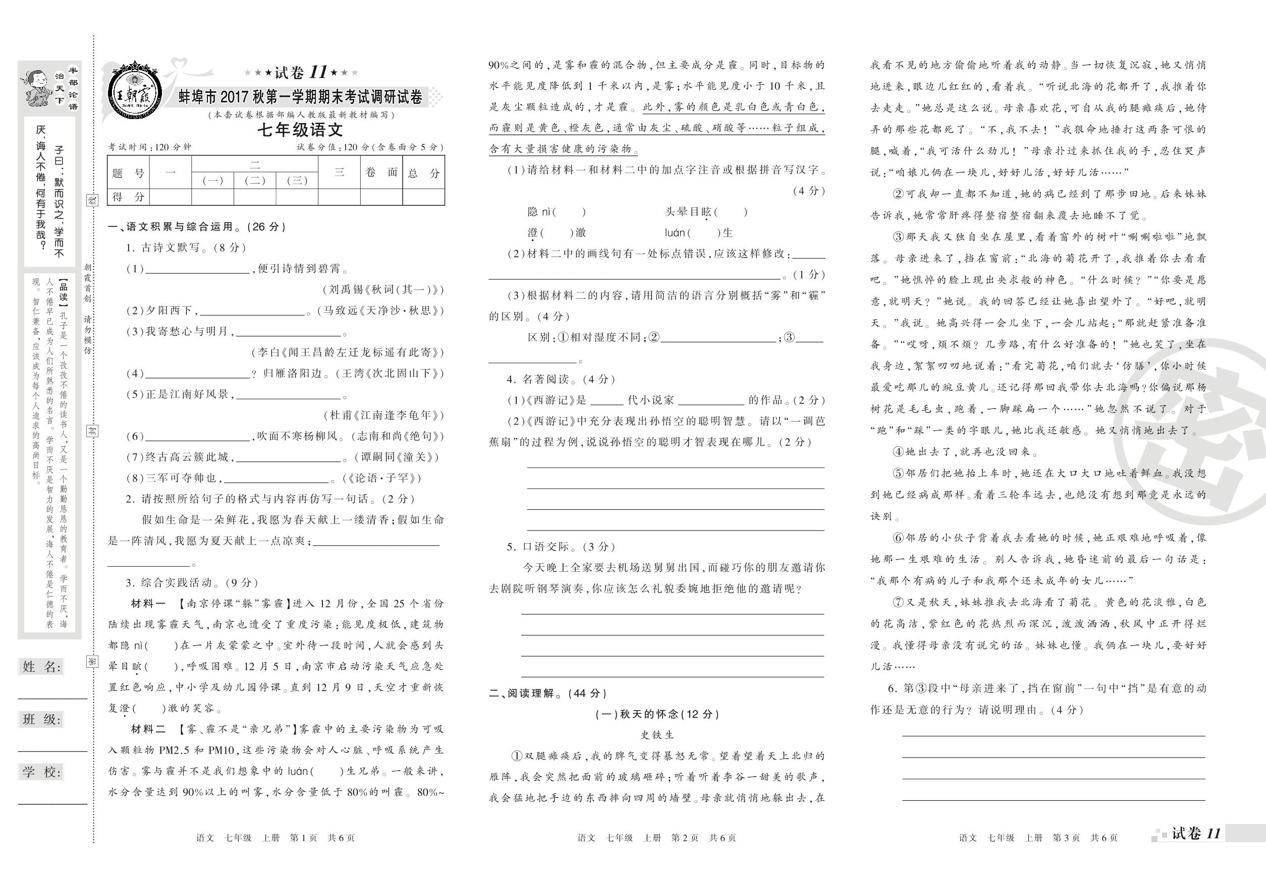 2016-2017学年第一学期蚌埠市七年级语文试卷(人教版)【11】