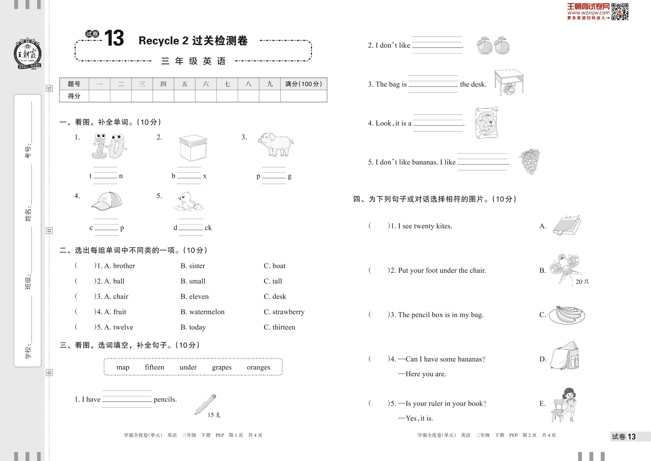 2023下册三年级英语人教PEP版 试卷13 Recycle 2 过关检测卷