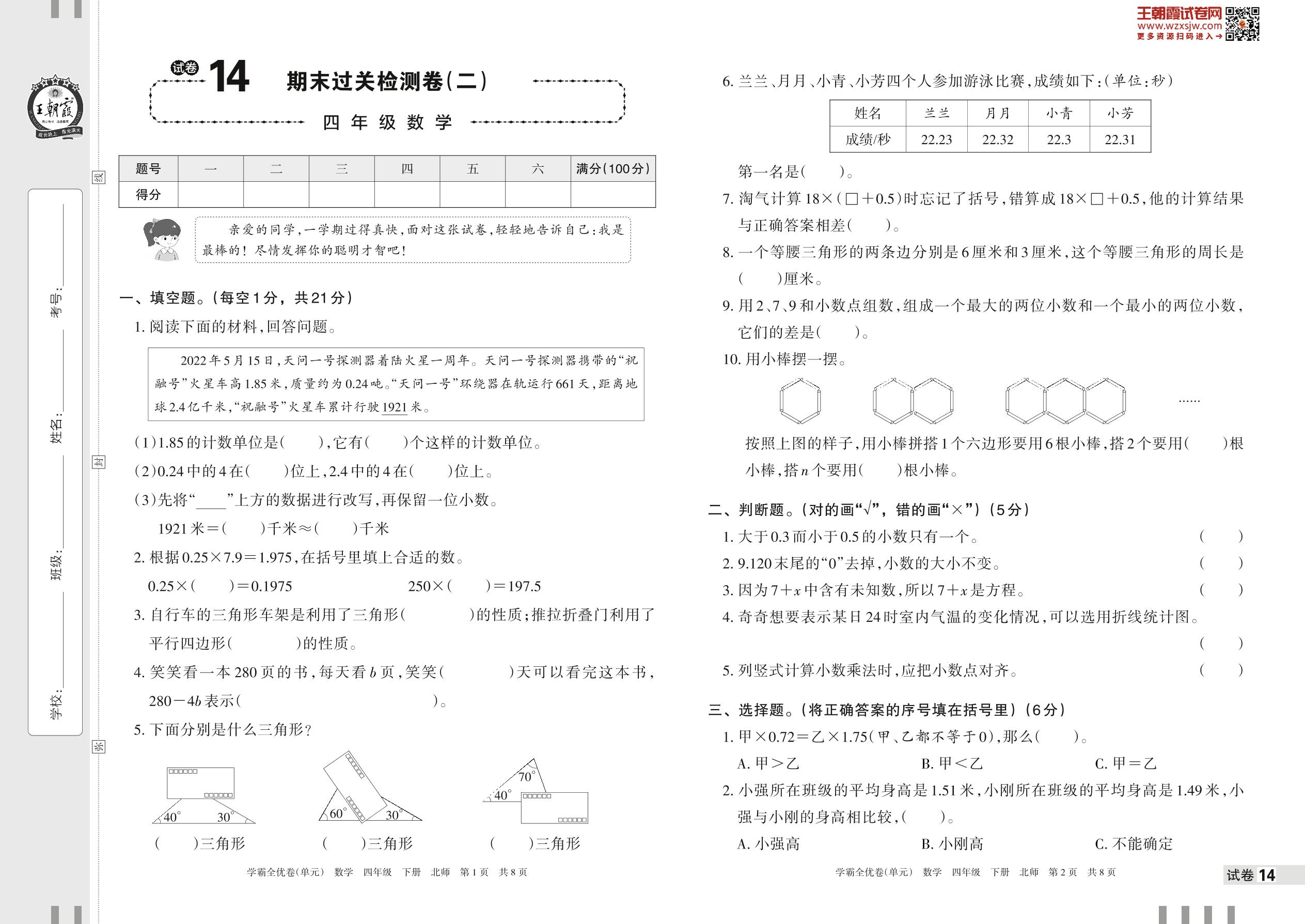 2023下册四年级数学北师版 试卷14 期末过关检测卷(二)