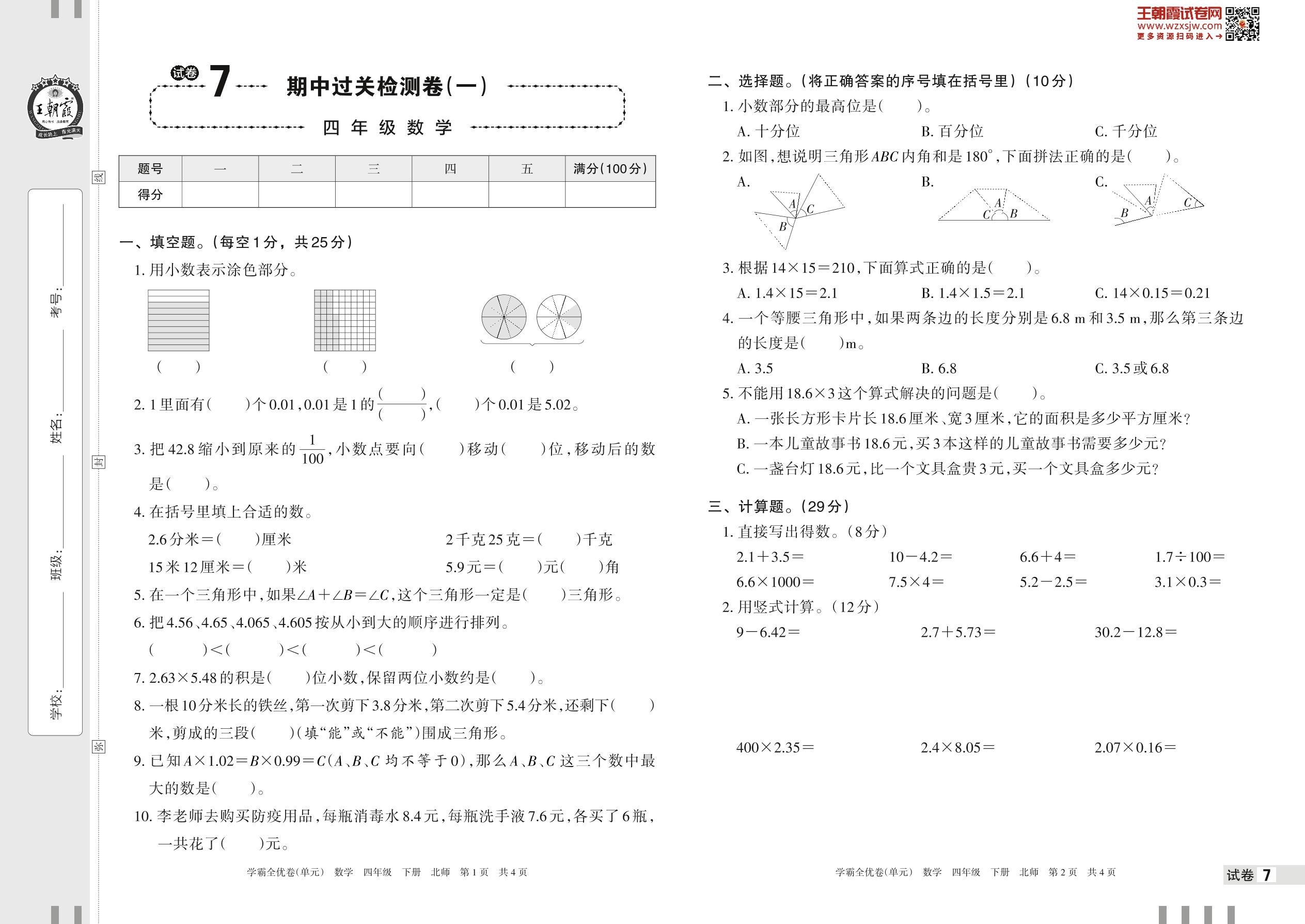 2023下册四年级数学北师版 试卷7 期中过关检测卷(一)
