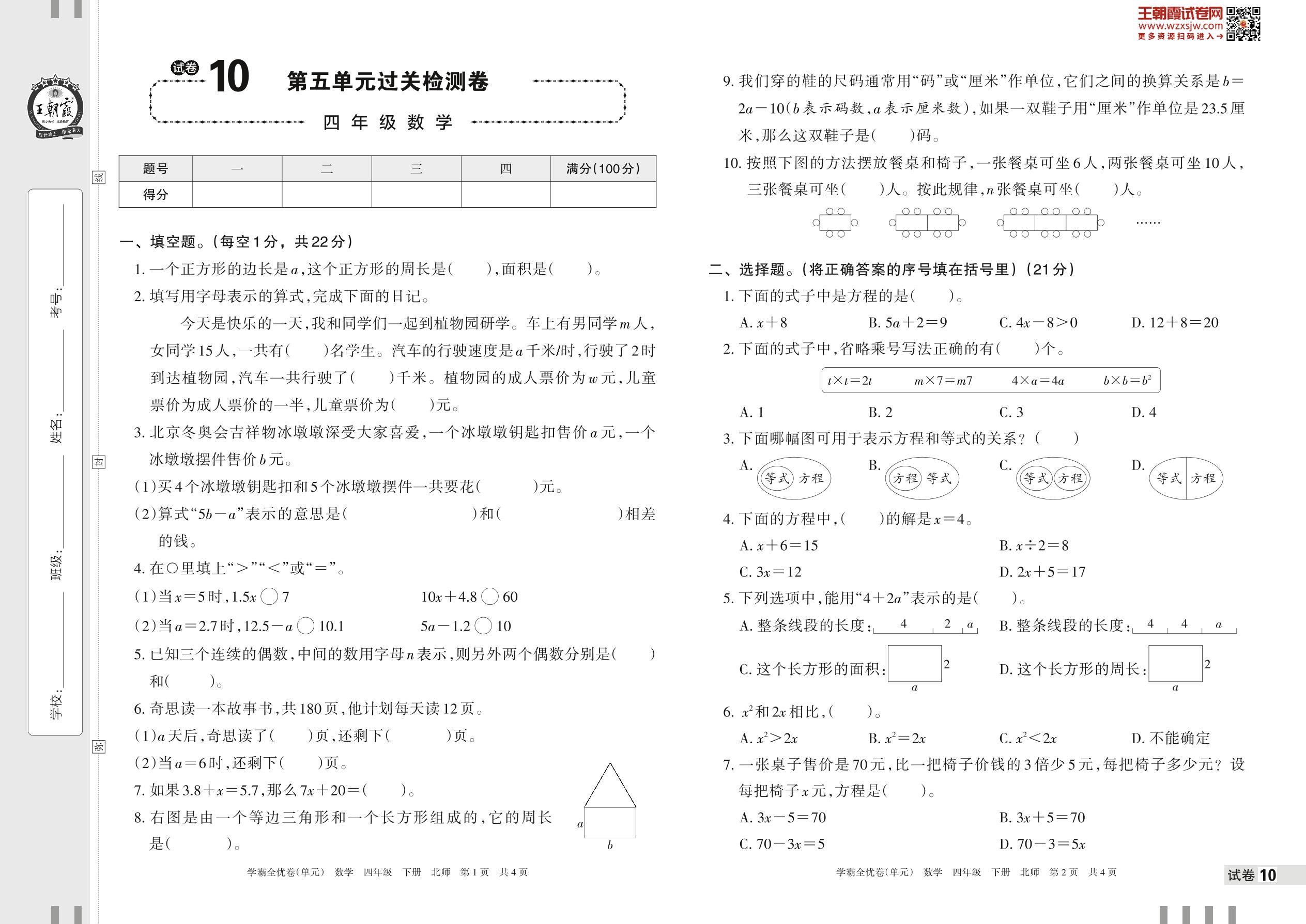 2023下册四年级数学北师版 试卷10 第五单元过关检测卷