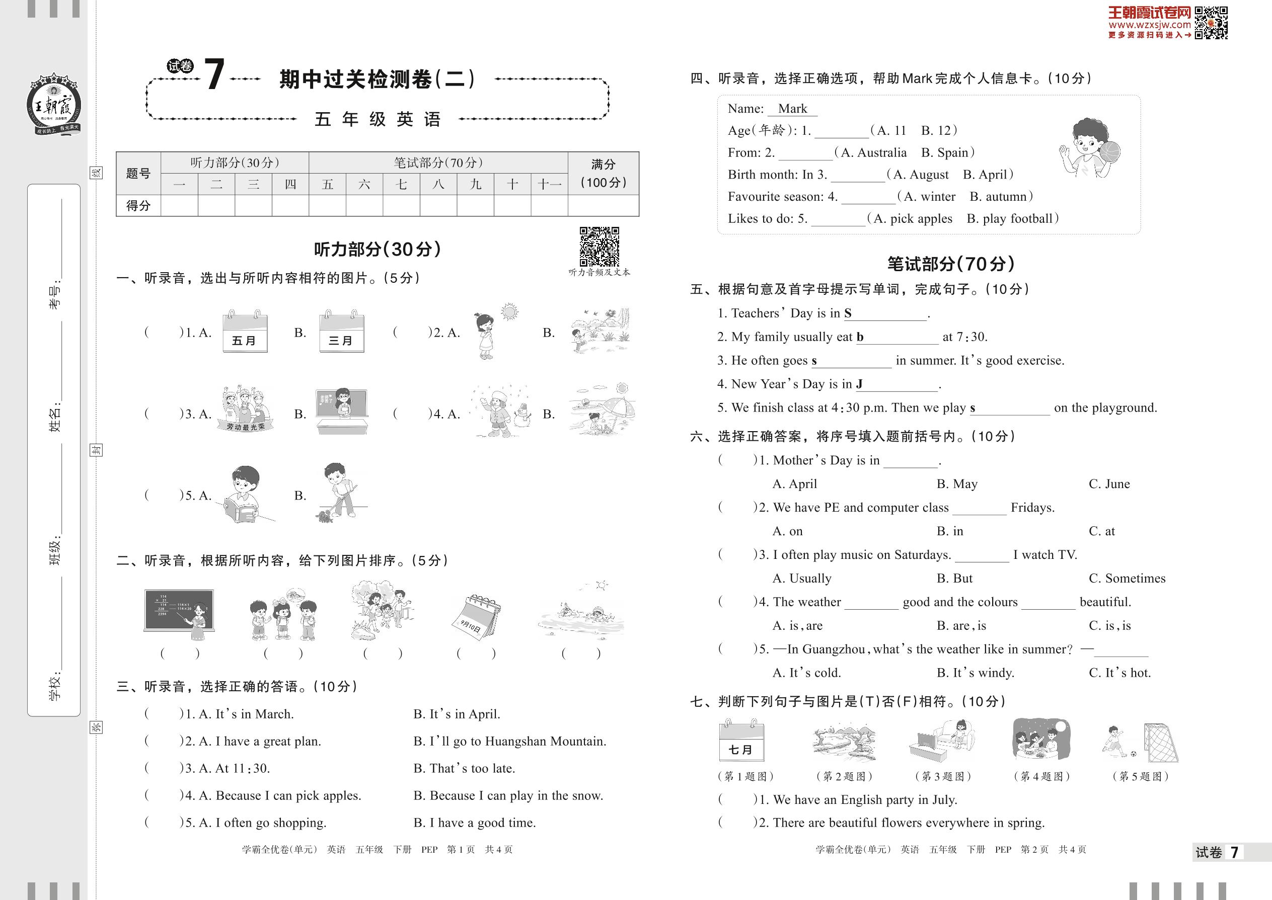 2023下册五年级英语人教PEP版 试卷7 期中过关检测卷(二)