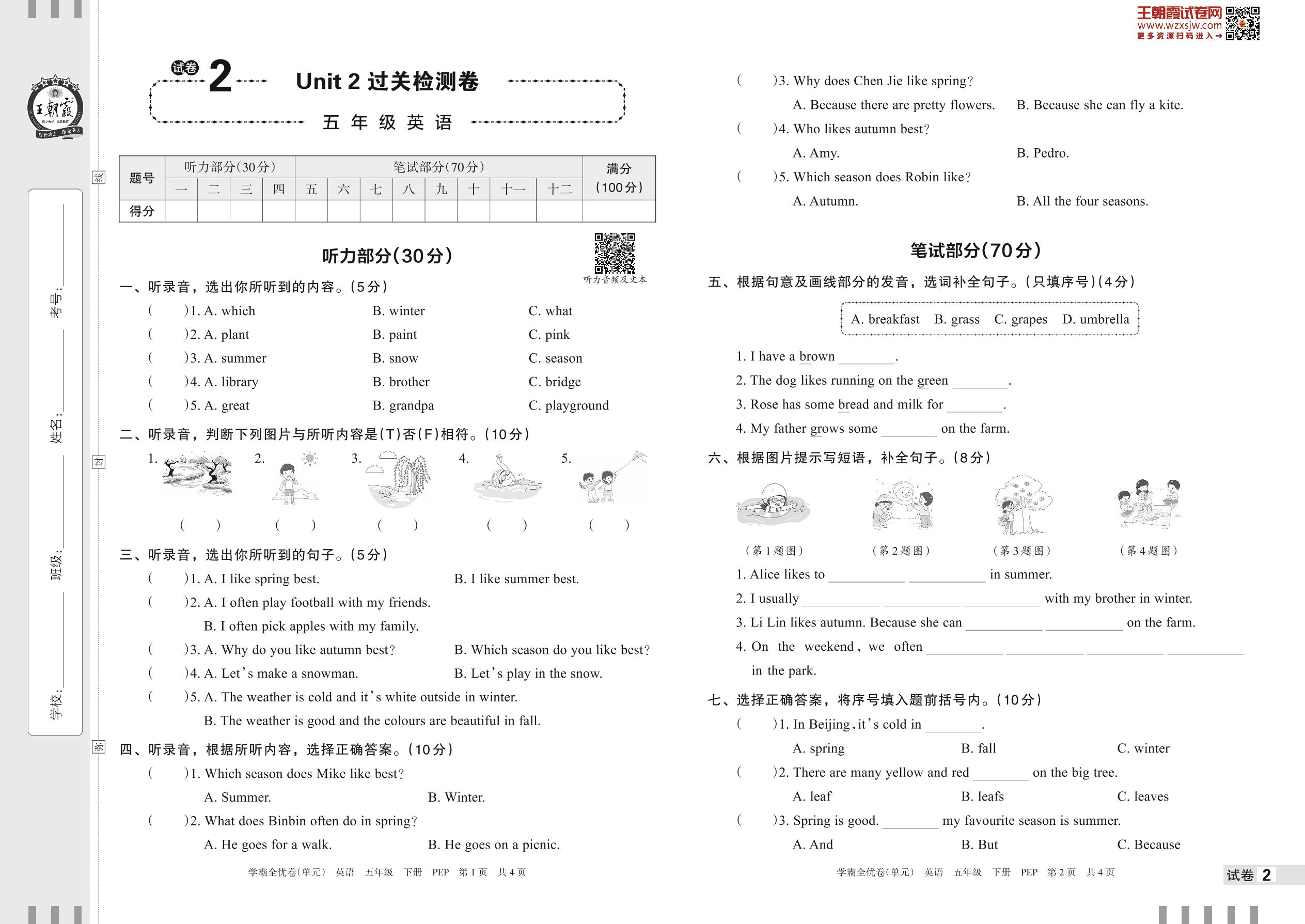 2023下册五年级英语人教PEP版 试卷2 Unit 2 过关检测卷