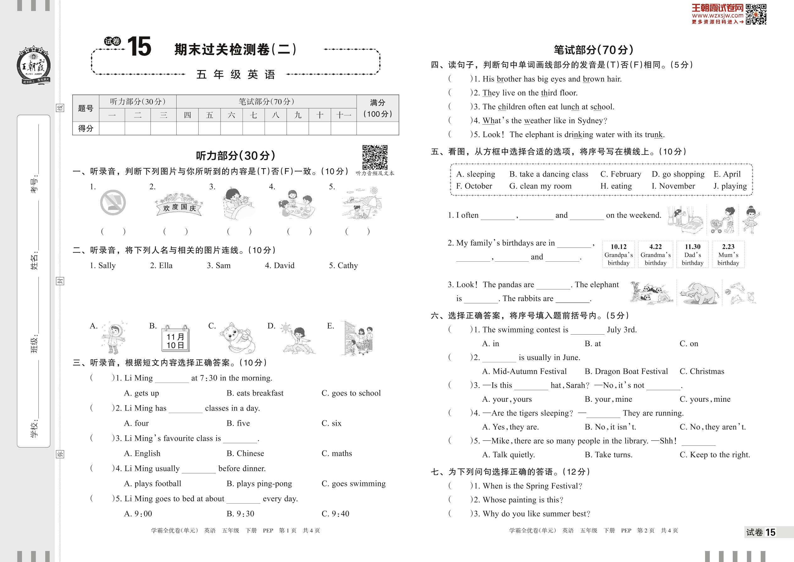 2023下册五年级英语人教PEP版 试卷15 期末过关检测卷(二)