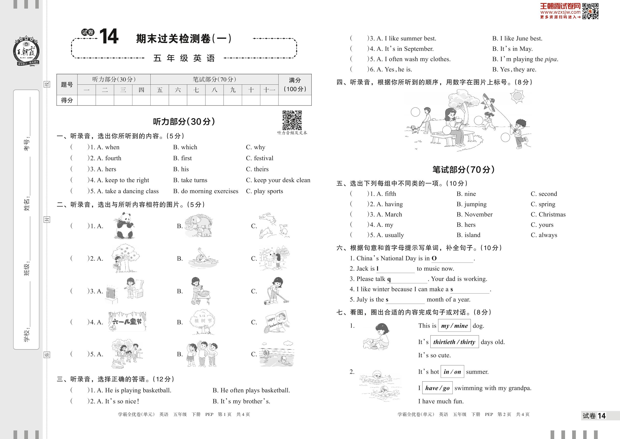 2023下册五年级英语人教PEP版 试卷14 期末过关检测卷(一)