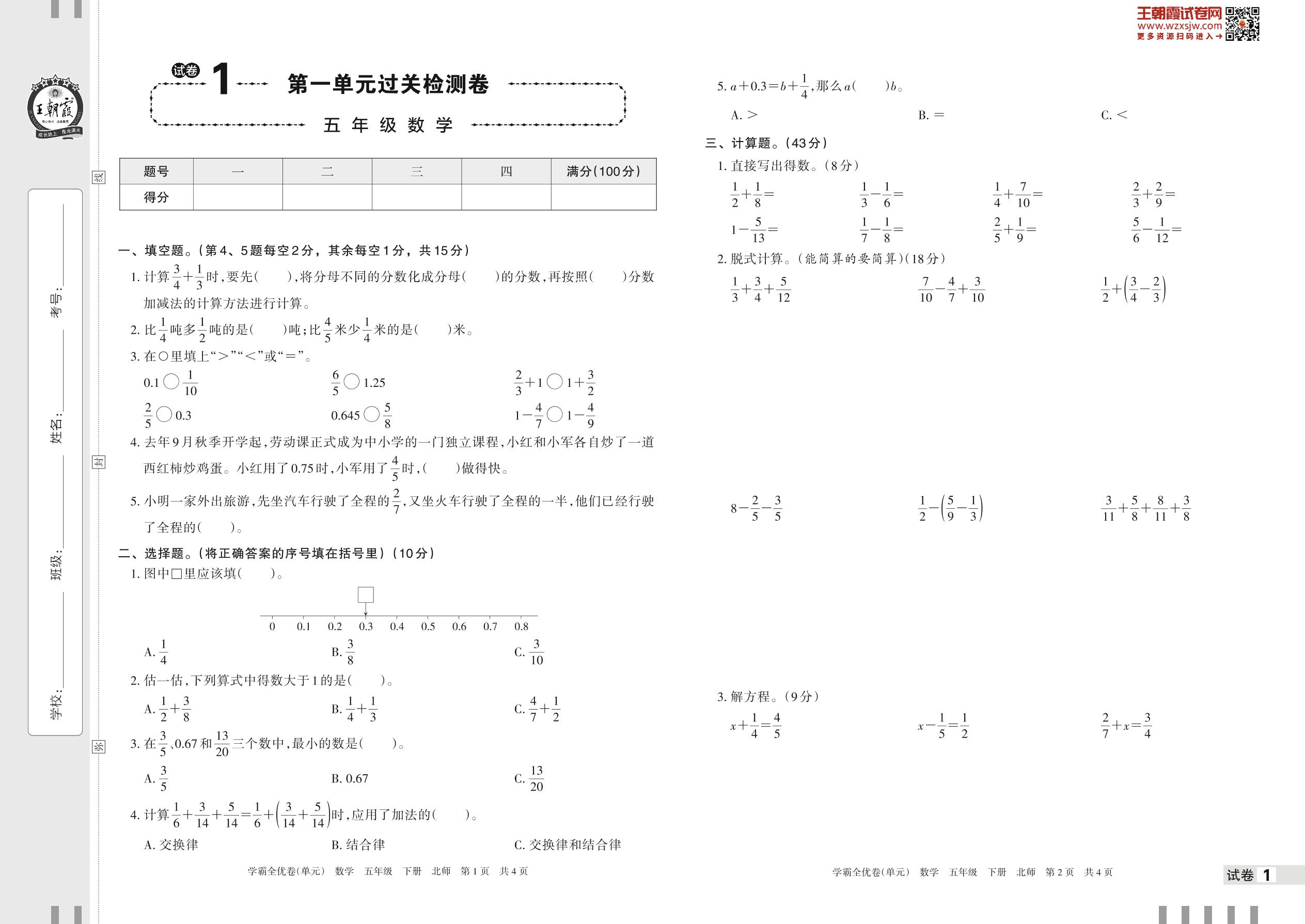 2023下册五年级数学北师版 试卷1 第一单元过关检测卷