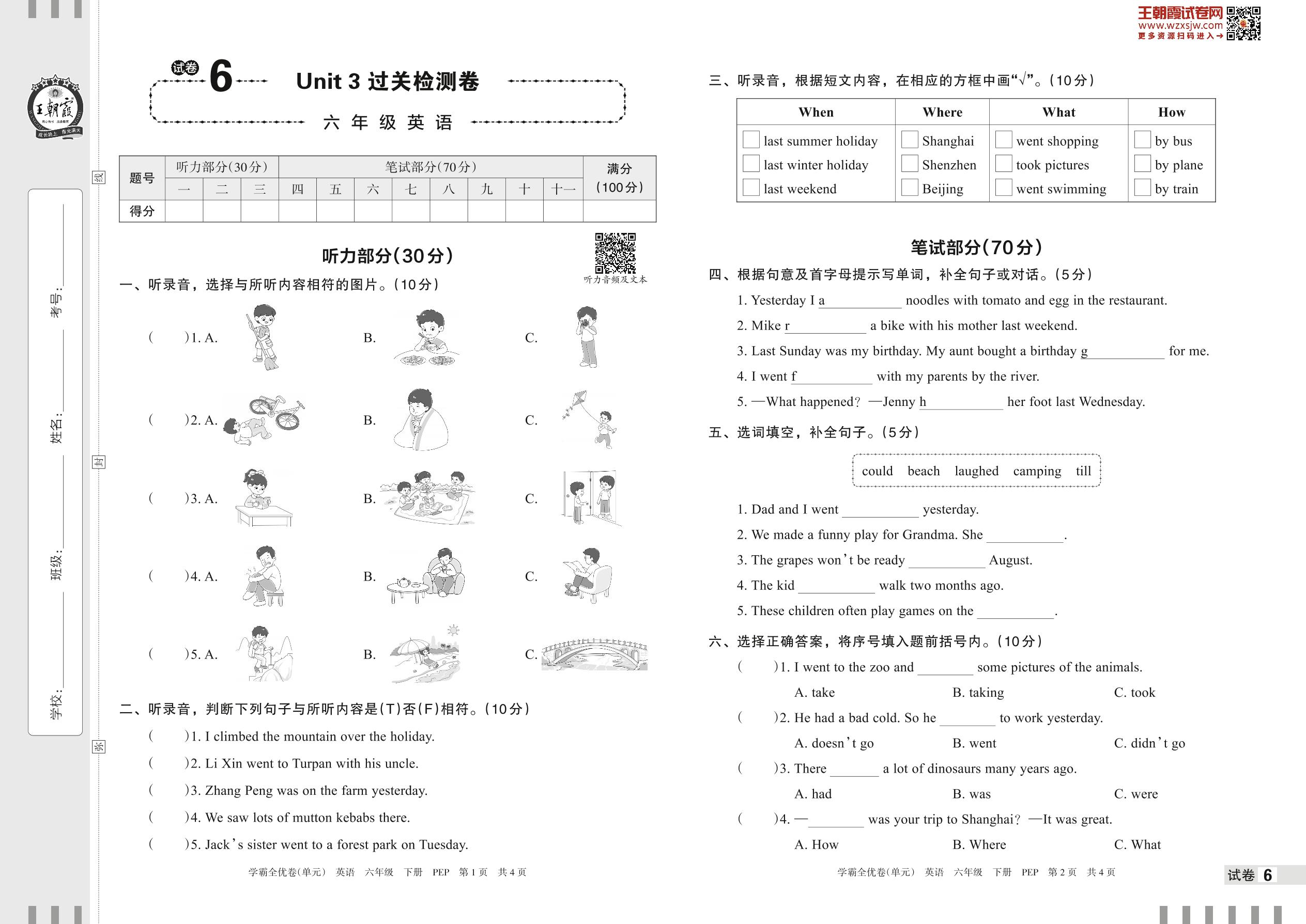 六年级英语人教PEP版(三起始)下册单元卷