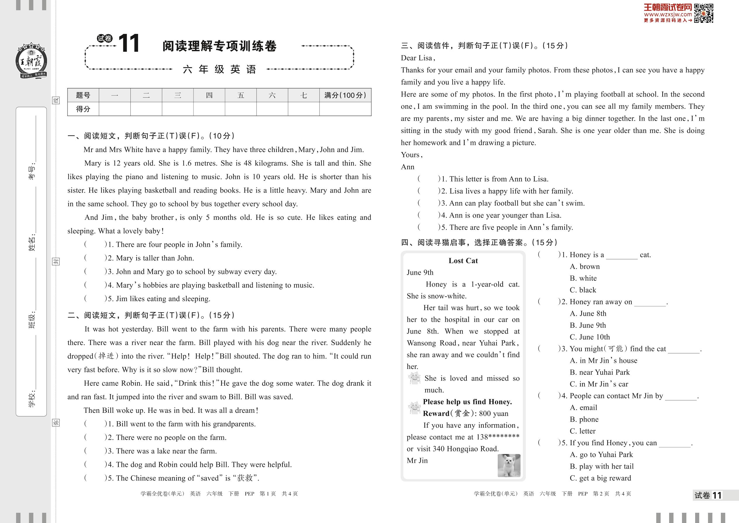 2023下册六年级英语人教PEP版 试卷11 阅读理解专项训练卷