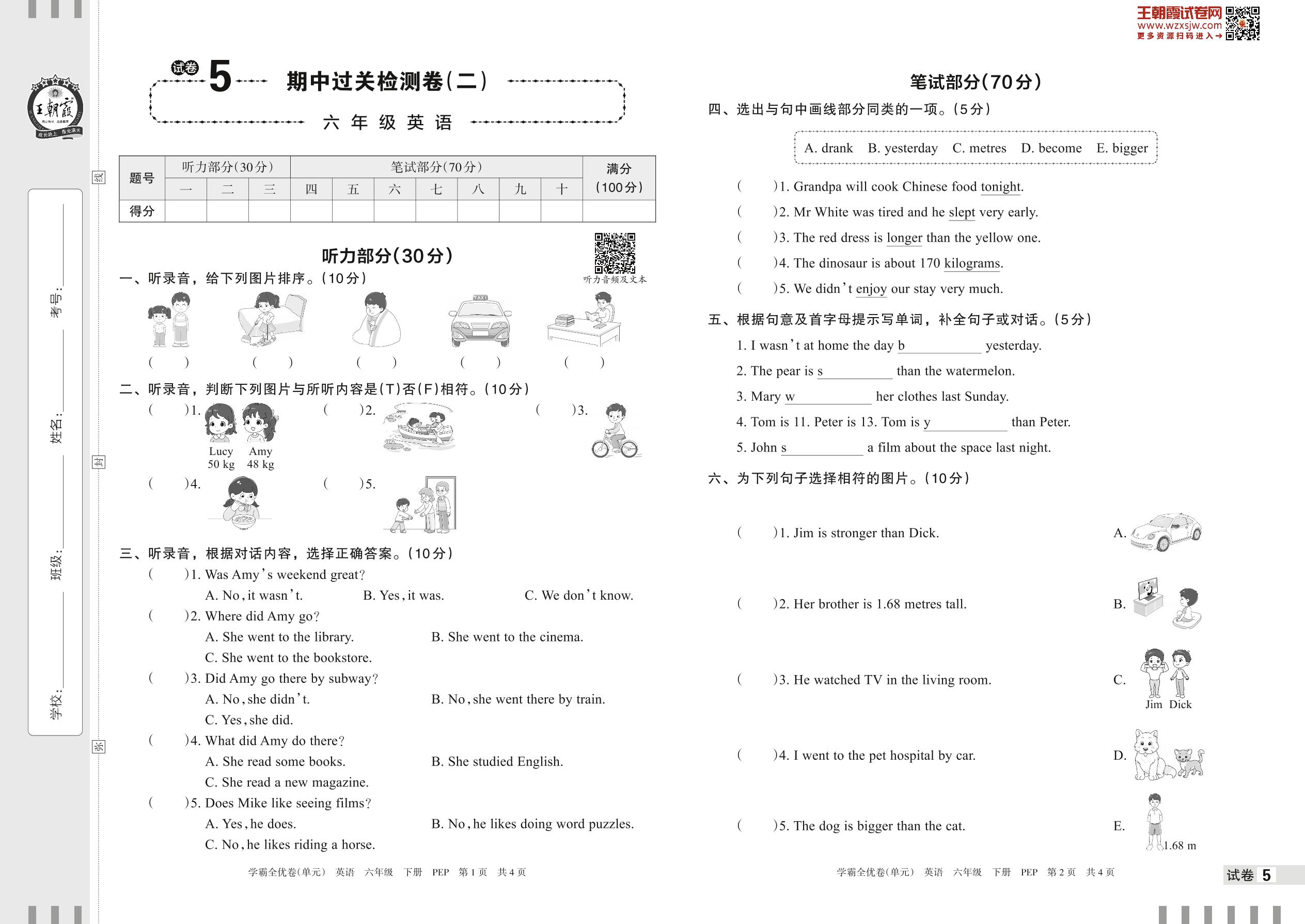 2023下册六年级英语人教PEP版 试卷5 期中过关检测卷(二)