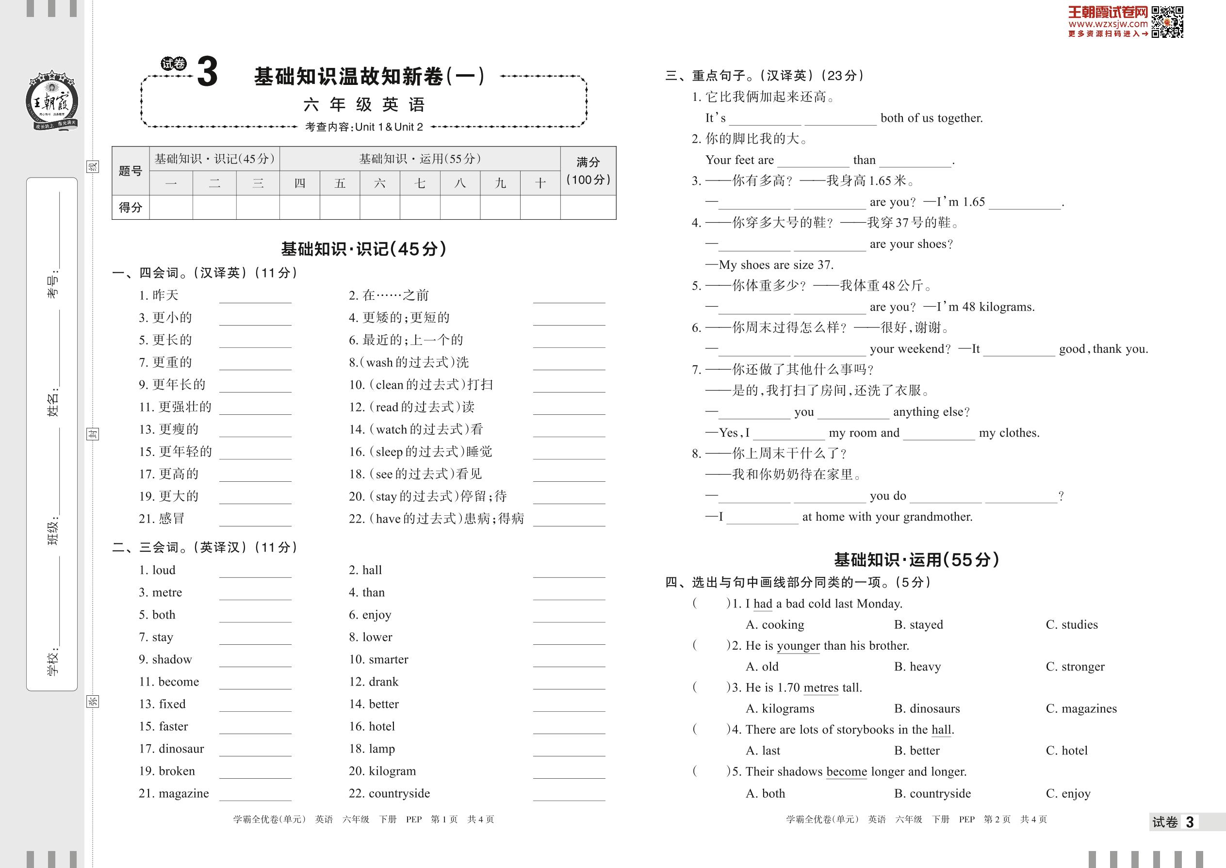 2023下册六年级英语人教PEP版 试卷3 基础知识温故知新卷(一)