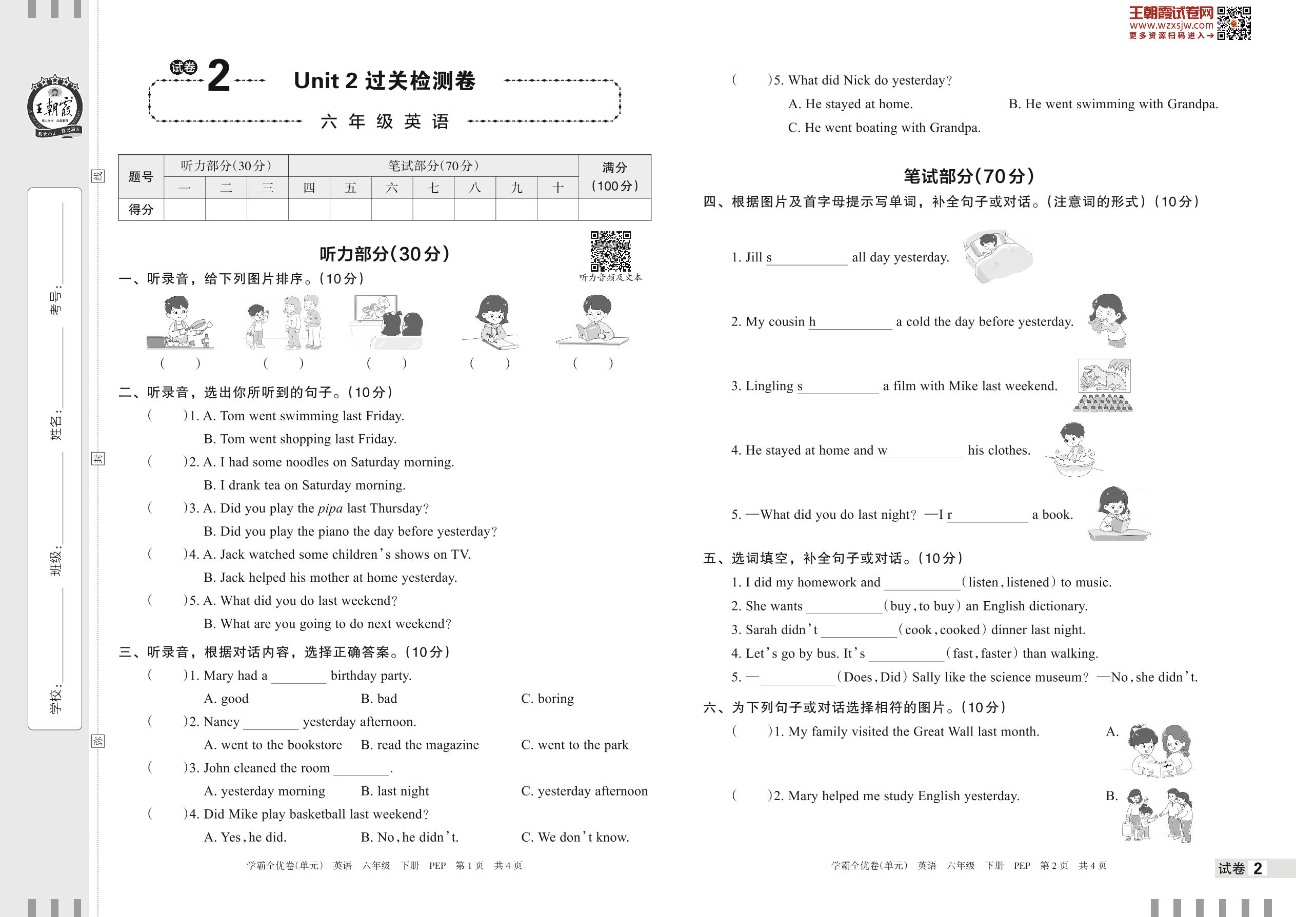 2023下册六年级英语人教PEP版 试卷2 Unit 2 过关检测卷