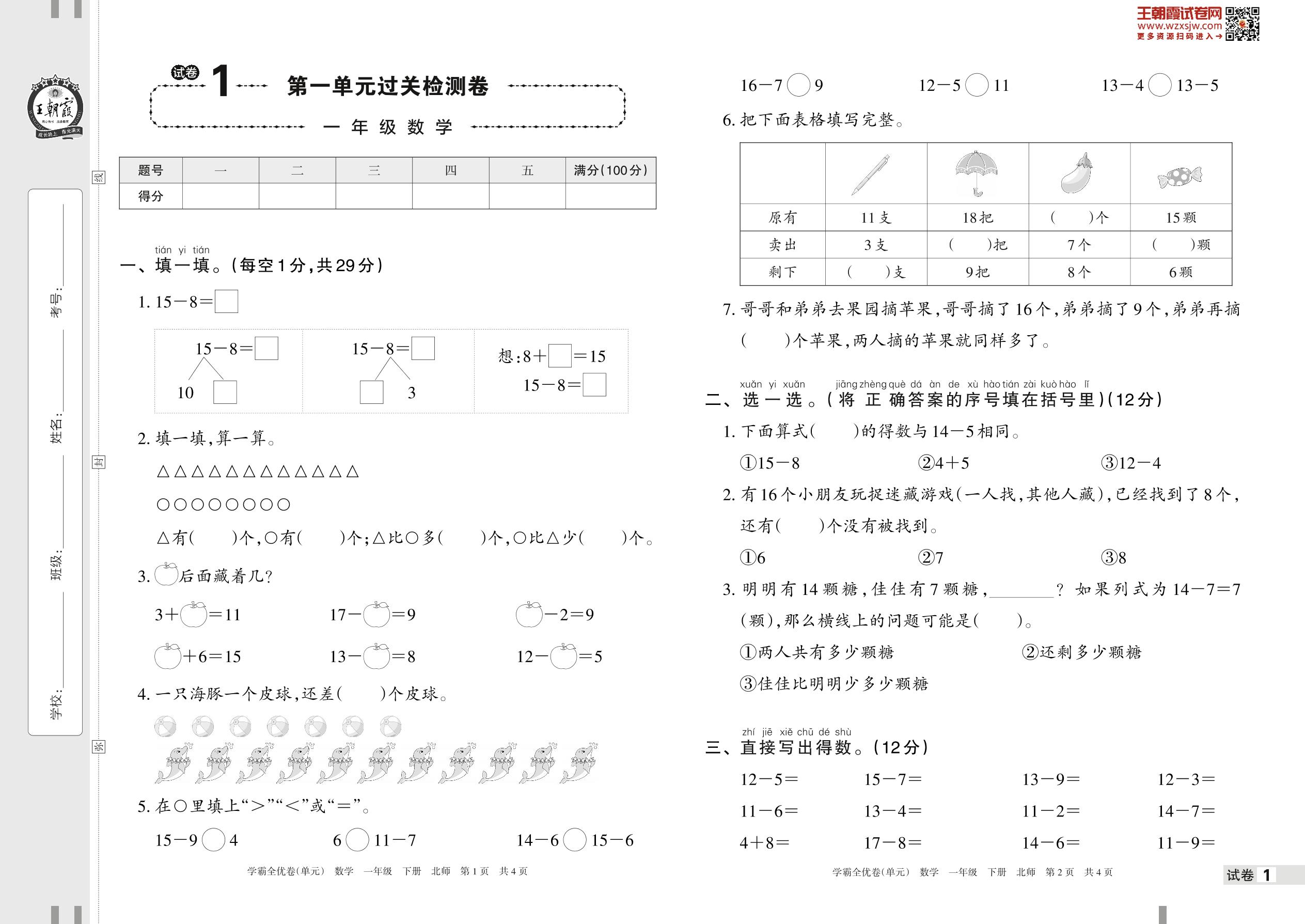 2023下册一年级数学北师版 试卷1 第一单元过关检测卷