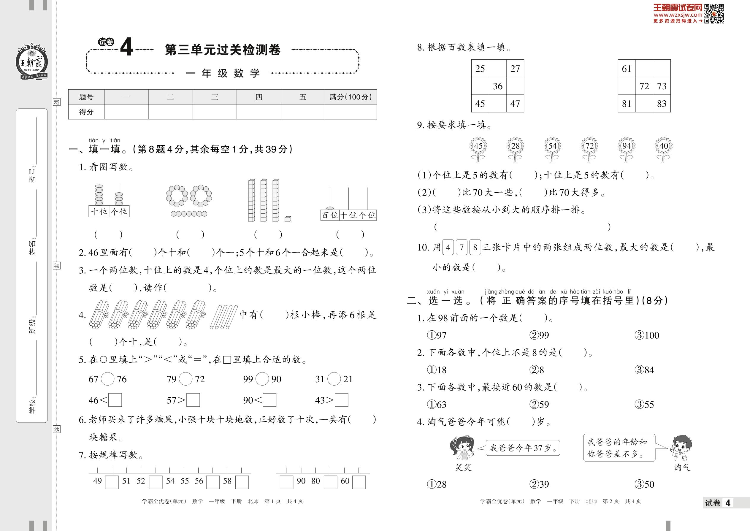 2023下册一年级数学北师版 试卷4 第三单元过关检测卷